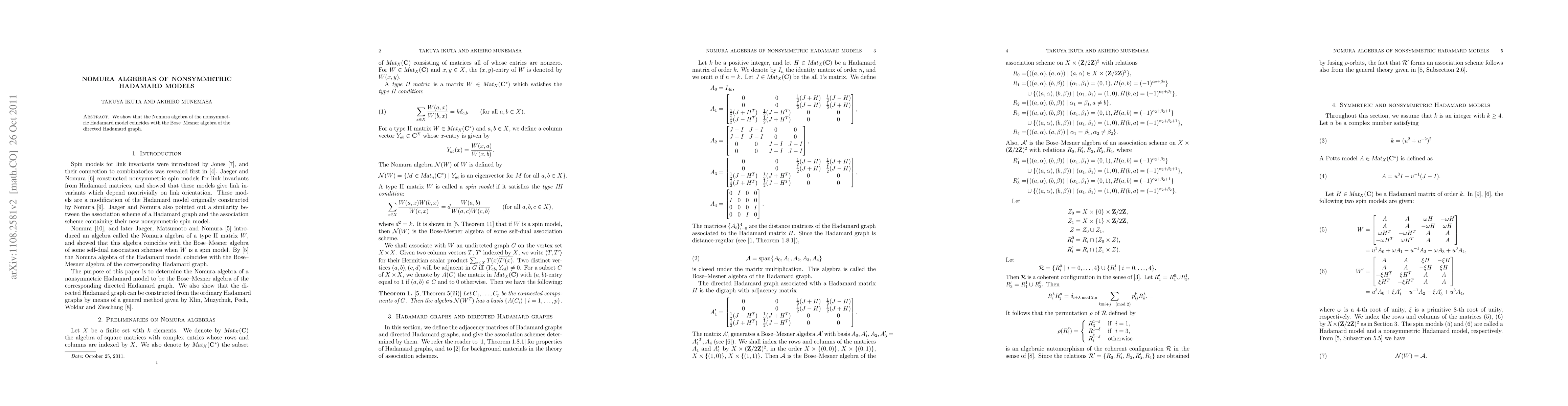 This paper demonstrates that the Nomura algebra associated with nonsymmetric Hadamard models is equivalent to the Bose-Mesner algebra of directed Hadamard graphs, revealing a deep connection between quantum mechanics and graph theory.