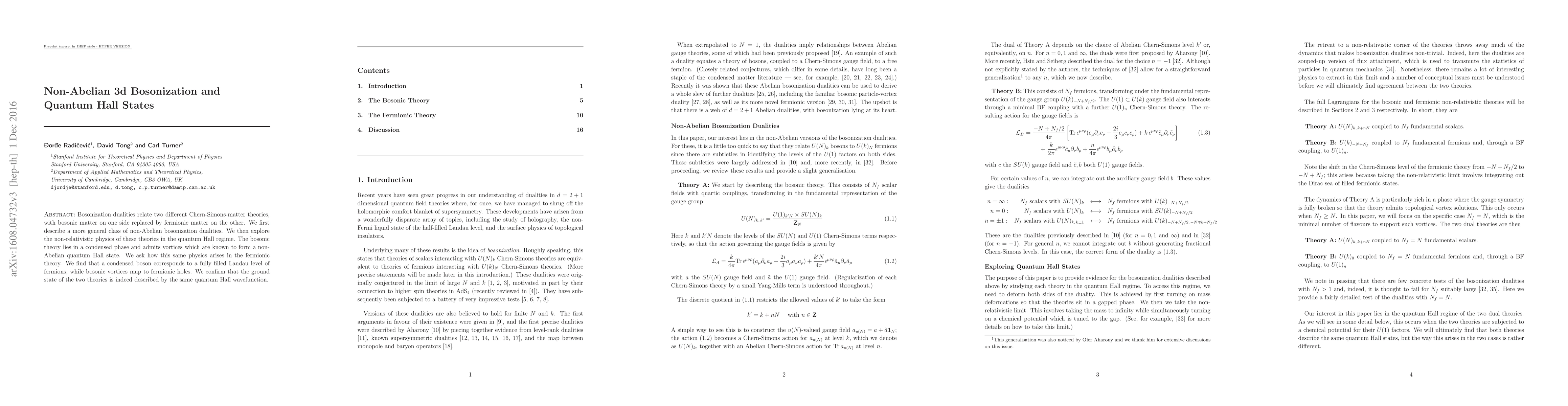 This paper explores non-Abelian bosonization dualities in Chern-Simons-matter theories, demonstrating how bosonic vortices in a condensed phase relate to fermionic holes in the quantum Hall regime, and confirming that both theories share the same quantum Hall wavefunction.