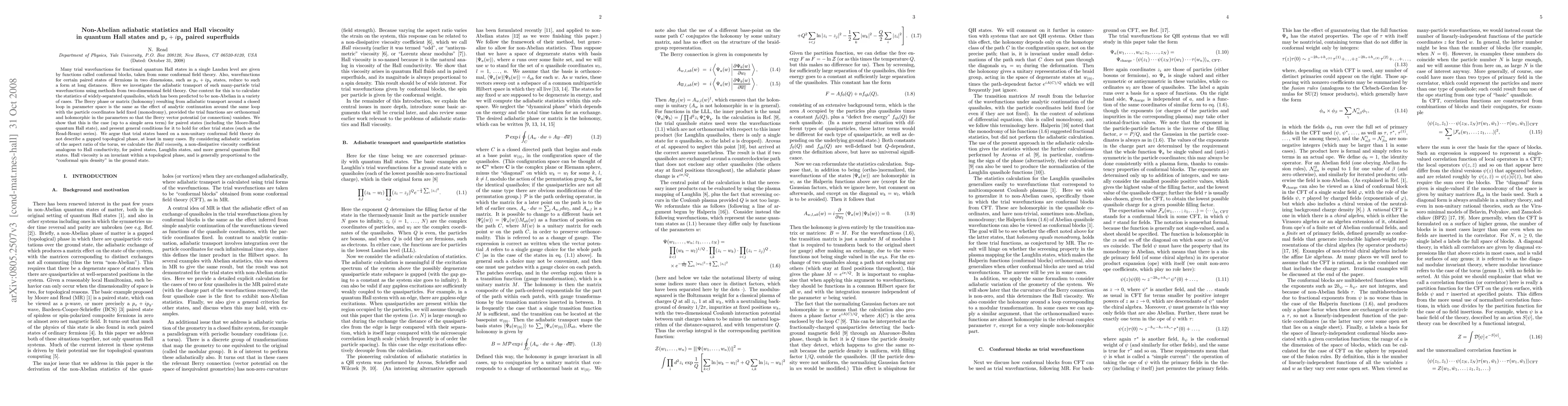 This paper investigates the adiabatic statistics and Hall viscosity in quantum Hall states and p_x+ip_y paired superfluids, showing that non-Abelian adiabatic transport corresponds to the analytic continuation of trial wavefunctions, and calculates Hall viscosity for various topological phases.