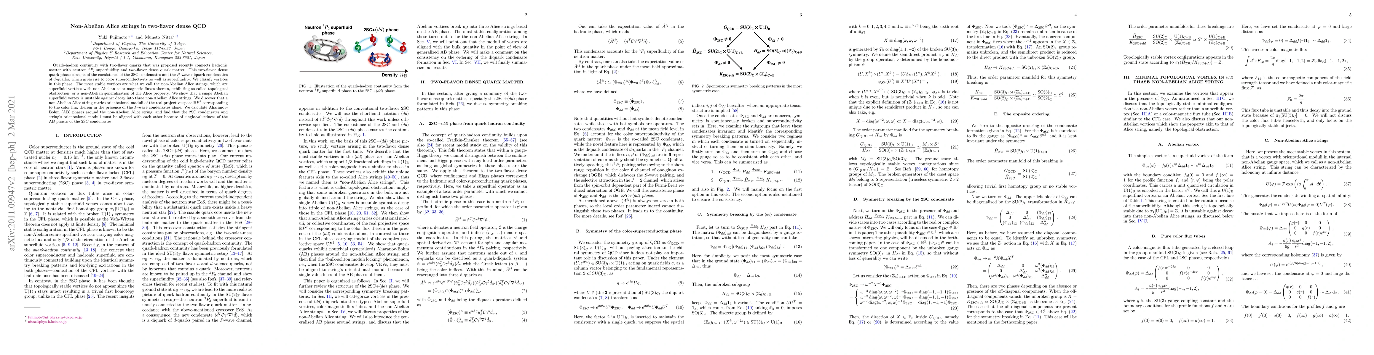 This paper explores the two-flavor dense quark phase in QCD, identifying non-Abelian Alice strings as stable vortices with unique topological properties. It demonstrates that these strings carry orientational moduli of $\mathbb{R}P^2$ and must align with 2SC condensates to maintain single-valued Aharanov-Bohm phases.