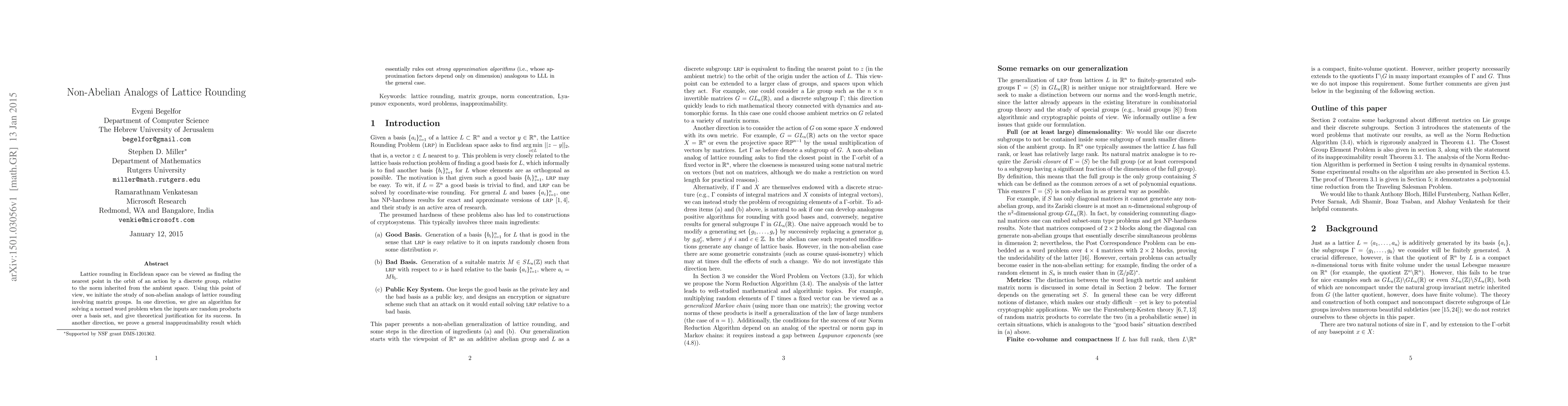 Researchers study non-Abelian analogs of lattice rounding using matrix groups, developing an algorithm for solving a normed word problem with random inputs and proving a general inapproximability result that limits strong approximation algorithms.