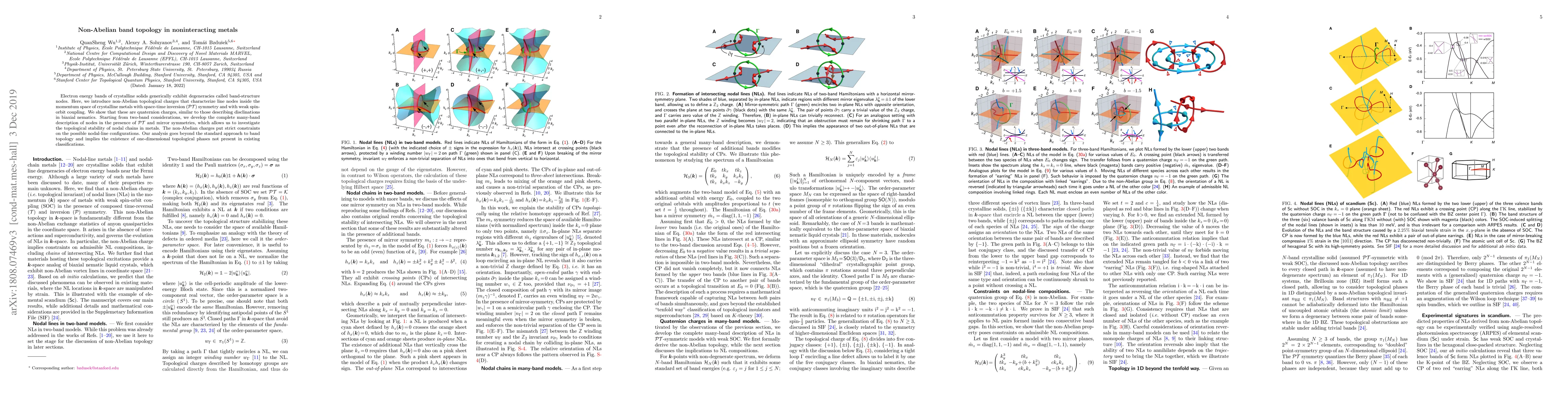 Electron energy bands of crystalline solids generically exhibit degeneracies called band-structure nodes. Here, we introduce non-Abelian topological charges that characterize line nodes inside the momentum space of crystalline metals with space-time inversion ($\mathcal{PT}$) symmetry and with weak spinorbit coupling. We show that these are quaternion charges, similar to those describing disclinations in biaxial nematics. Starting from two-band considerations, we develop the complete many-band description of nodes in the presence of $\mathcal{PT}$ and mirror symmetries, which allows us to investigate the topological stability of nodal chains in metals. The non-Abelian charges put strict constraints on the possible nodal-line configurations. Our analysis goes beyond the standard approach to band topology and implies the existence of one-dimensional topological phases not present in existing classifications.
