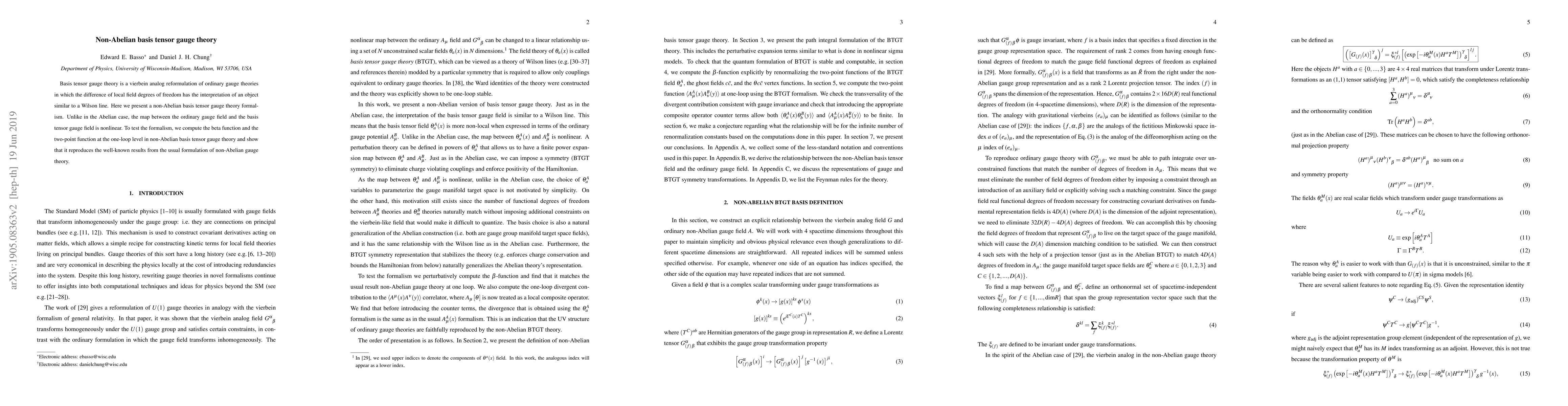Basis tensor gauge theory is a vierbein analog reformulation of ordinary gauge theories in which the difference of local field degrees of freedom has the interpretation of an object similar to a Wilson line. Here we present a non-Abelian basis tensor gauge theory formalism. Unlike in the Abelian case, the map between the ordinary gauge field and the basis tensor gauge field is nonlinear. To test the formalism, we compute the beta function and the two-point function at the one-loop level in non-Abelian basis tensor gauge theory and show that it reproduces the well-known results from the usual formulation of non-Abelian gauge theory.