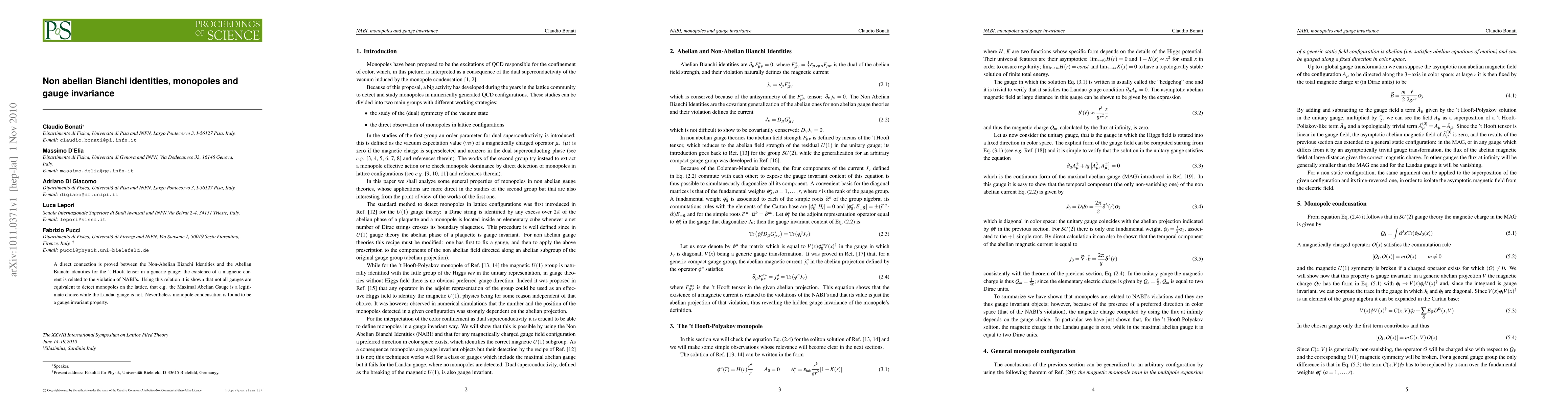 The paper establishes a connection between Non-Abelian Bianchi Identities and Abelian Bianchi identities for 't Hooft tensors, showing that magnetic current presence correlates with NABI violations. It concludes that monopole detection varies by gauge choice, with the Maximal Abelian Gauge being valid while the Landau gauge is not, yet monopole condensation remains gauge invariant.