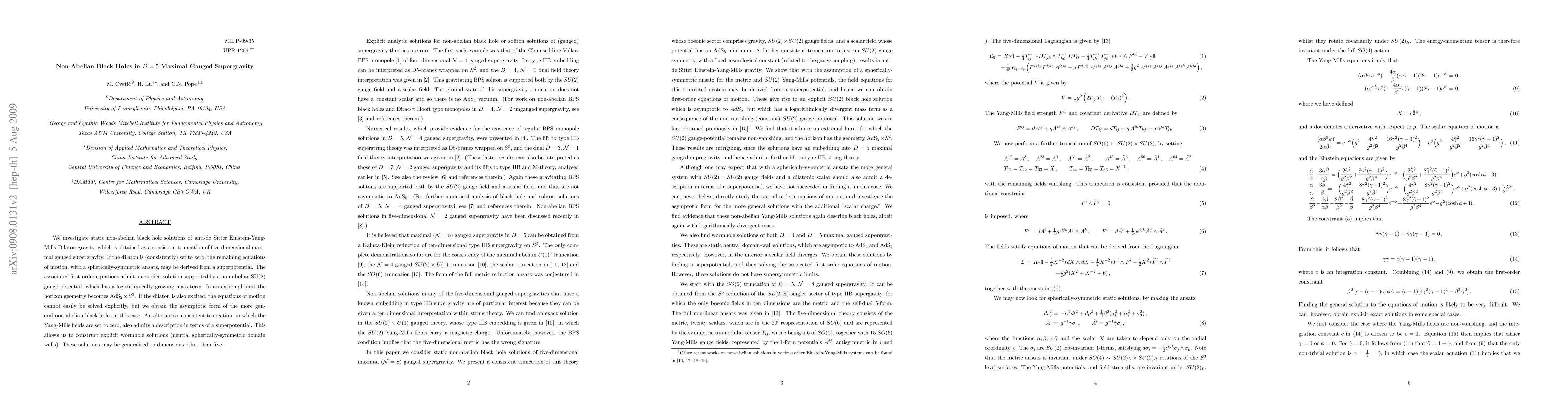 We investigate static non-abelian black hole solutions of anti-de Sitter Einstein-Yang-Mills-Dilaton gravity, which is obtained as a consistent truncation of five-dimensional maximal gauged supergravity. If the dilaton is (consistently) set to zero, the remaining equations of motion, with a spherically-symmetric ansatz, may be derived from a superpotential. The associated first-order equations admit an explicit solution supported by a non-abelian SU(2) gauge potential, which has a logarithmically growing mass term. In an extremal limit the horizon geometry becomes AdS$_2\times S^3$. If the dilaton is also excited, the equations of motion cannot easily be solved explicitly, but we obtain the asymptotic form of the more general non-abelian black holes in this case. An alternative consistent truncation, in which the Yang-Mills fields are set to zero, also admits a description in terms of a superpotential. This allows us to construct explicit wormhole solutions (neutral spherically-symmetric domain walls). These solutions may be generalised to dimensions other than five.