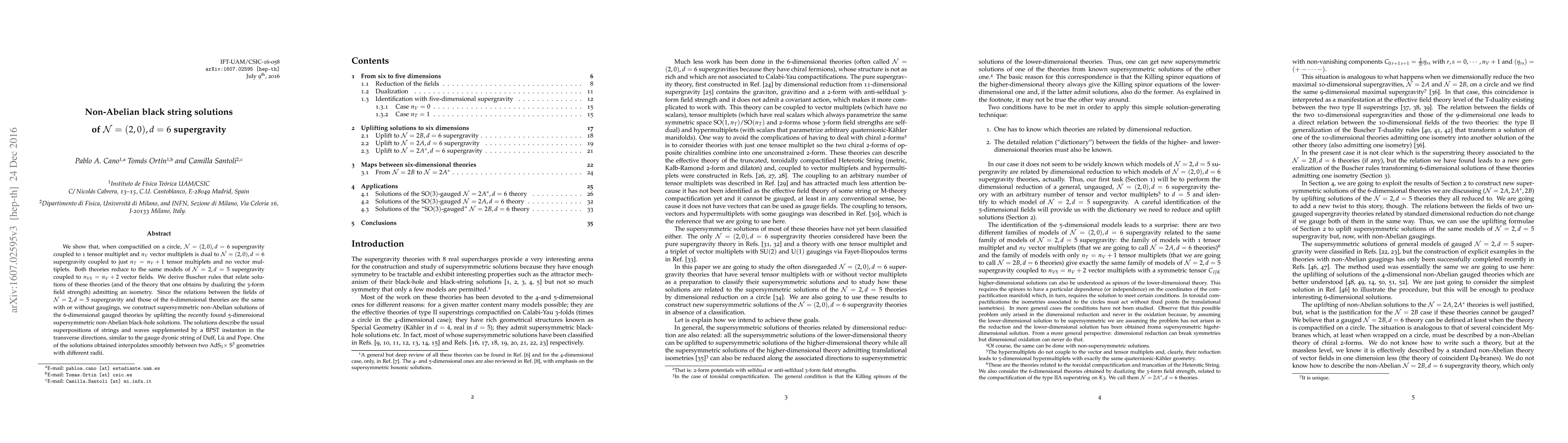 This paper explores non-Abelian black string solutions in N=(2,0),d=6 supergravity, showing that compactification on a circle leads to a duality between different formulations of the theory. It constructs supersymmetric solutions by uplifting 5-dimensional black-hole solutions, describing configurations that include strings, waves, and BPST instantons.