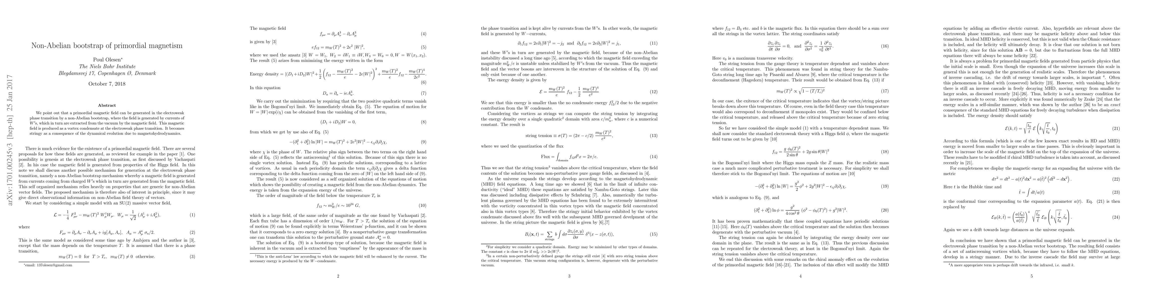 We point out that a primordial magnetic field can be generated in the electroweak phase transition by a non-Abelian bootstrap, where the field is generated by currents of W's, which in turn are extracted from the vacuum by the magnetic field. This magnetic field is produced as a vortex condensate at the electroweak phase transition. It becomes stringy as a consequence of the dynamical evolution due to magnetohydrodynamics.