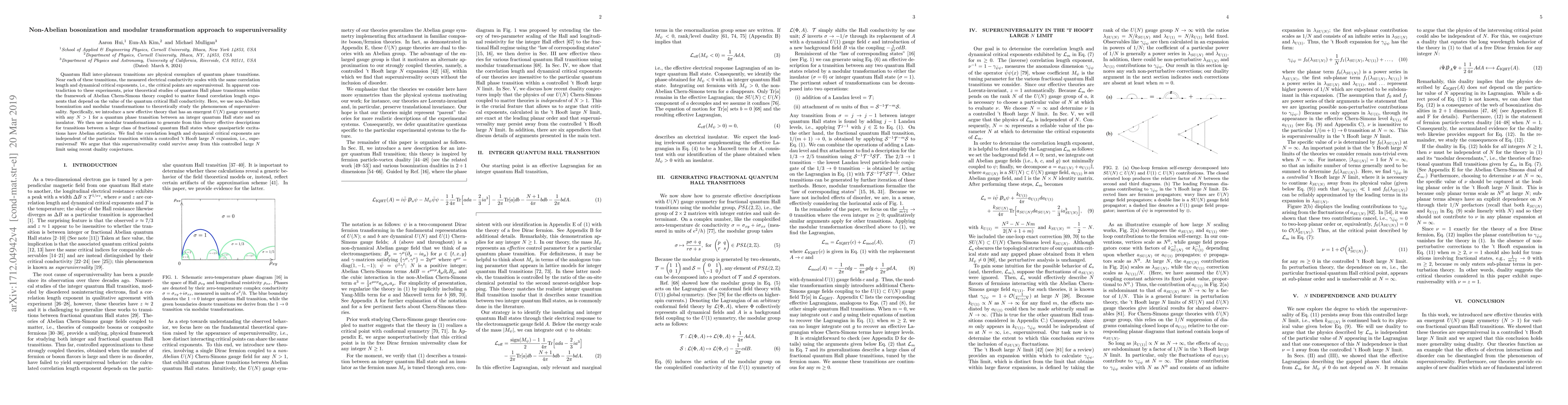 This paper proposes a non-Abelian bosonization and modular transformation approach to explain superuniversality in quantum Hall inter-plateaux transitions, finding that correlation length and dynamical critical exponents are independent of the transition type within a 't Hooft large $N$ expansion. The study introduces an effective $U(N)$ gauge theory to describe these transitions.