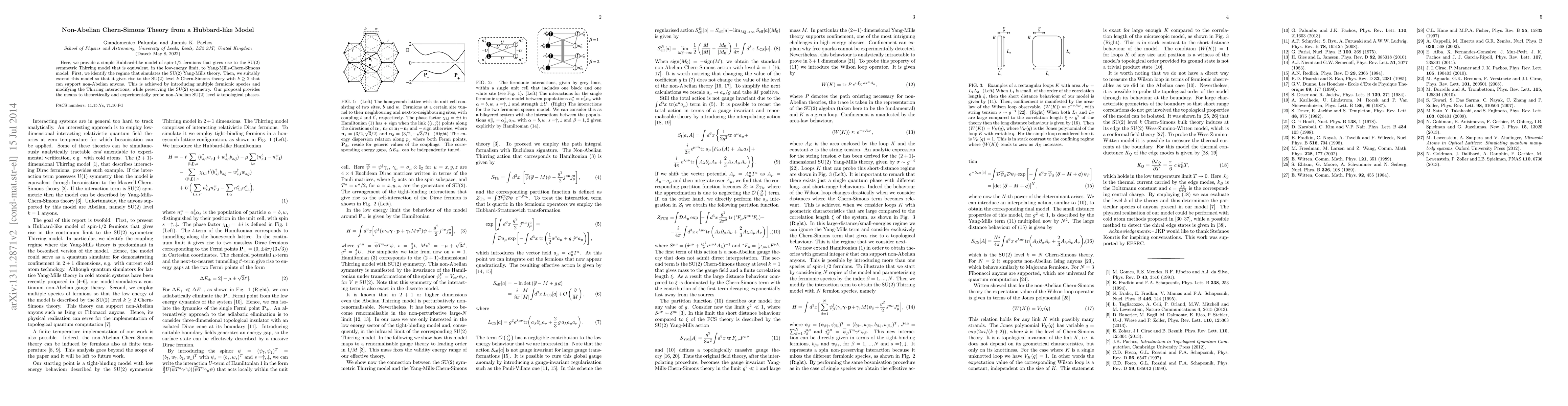 This paper proposes a Hubbard-like model of spin-$1/2$ fermions to simulate the SU(2) Yang-Mills theory and extends it to generate the SU(2) level $k$ Chern-Simons theory, supporting non-Abelian anyons, thus offering a pathway to explore topological phases.