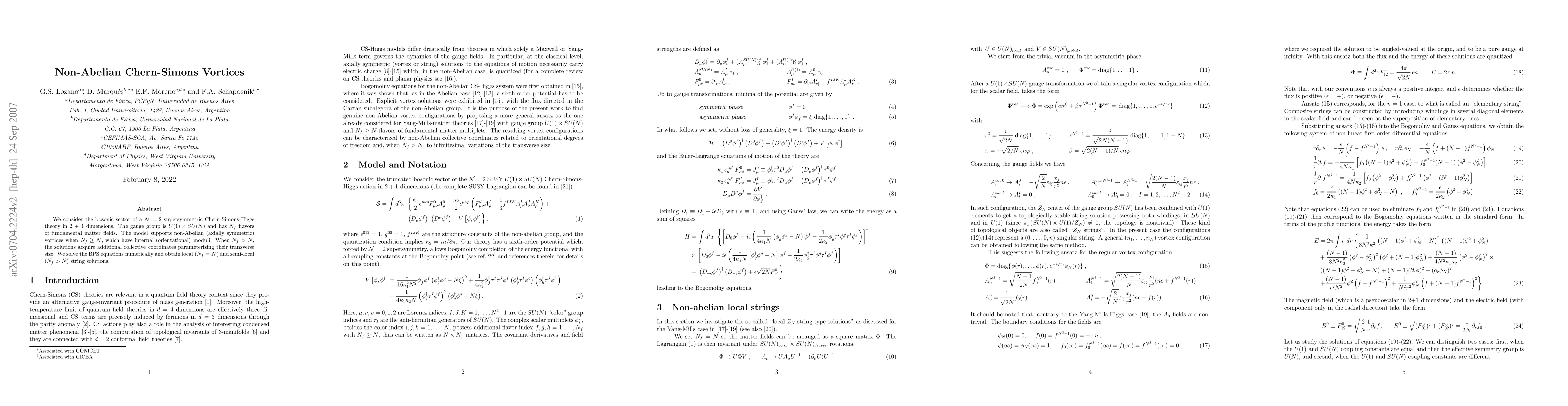 This paper studies N=2 supersymmetric Chern-Simons-Higgs theory with U(1)xU(N) gauge group and N_f flavors of matter fields, revealing non-Abelian vortices when N_f ≥ N with internal moduli and additional size coordinates when N_f > N, deriving local and semi-local string solutions through numerical BPS equation solutions.