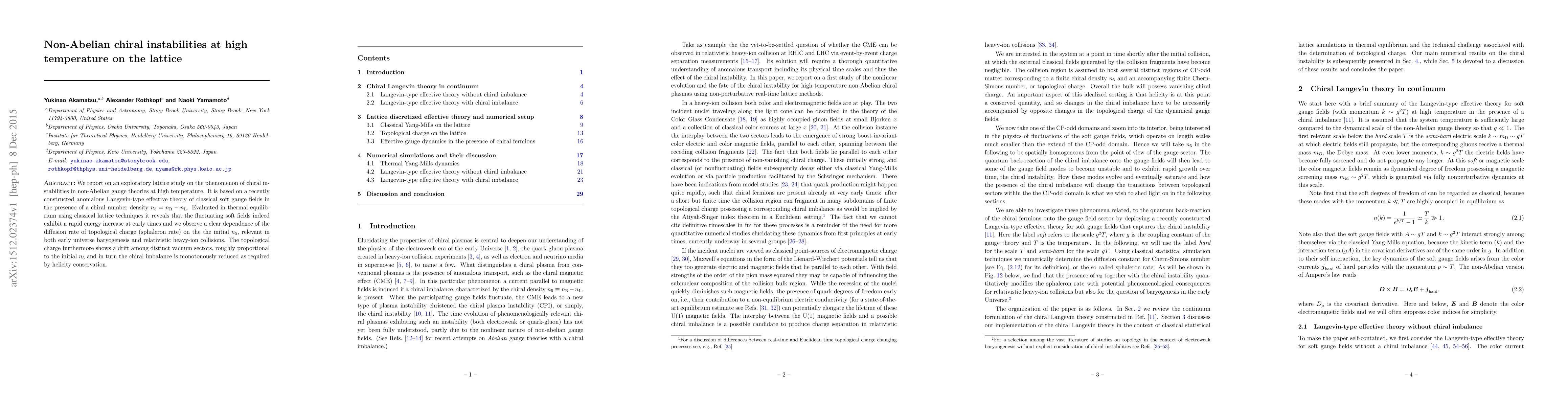 We report on an exploratory lattice study on the phenomenon of chiral instabilities in non-Abelian gauge theories at high temperature. It is based on a recently constructed anomalous Langevin-type effective theory of classical soft gauge fields in the presence of a chiral number density $n_5=n_{\rm R}-n_{\rm L}$. Evaluated in thermal equilibrium using classical lattice techniques it reveals that the fluctuating soft fields indeed exhibit a rapid energy increase at early times and we observe a clear dependence of the diffusion rate of topological charge (sphaleron rate) on the the initial $n_5$, relevant in both early universe baryogenesis and relativistic heavy-ion collisions. The topological charge furthermore shows a drift among distinct vacuum sectors, roughly proportional to the initial $n_5$ and in turn the chiral imbalance is monotonously reduced as required by helicity conservation.