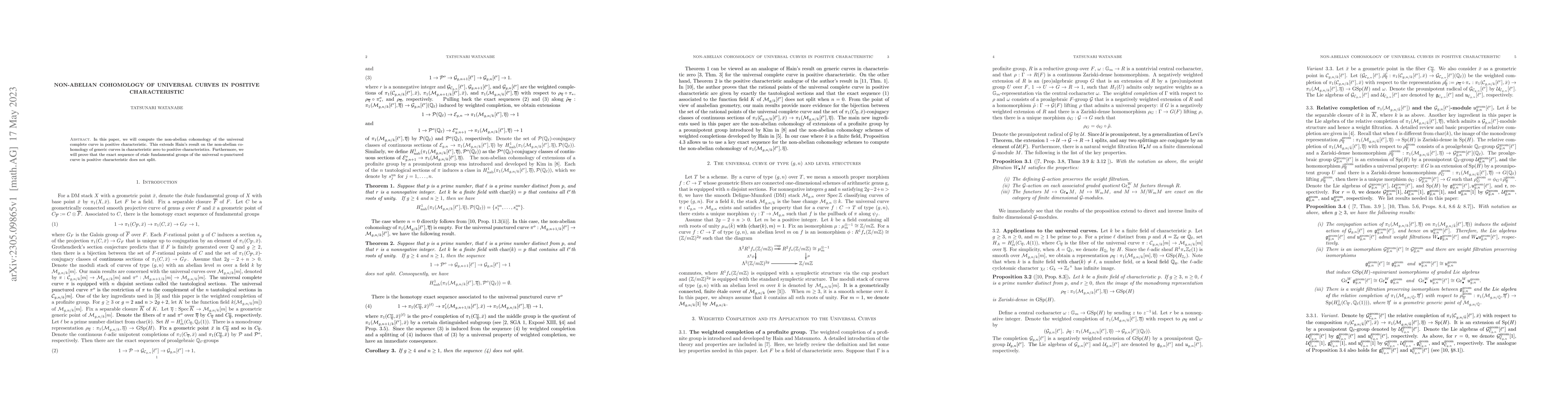 In this paper, we will compute the non-abelian cohomology of the universal complete curve in positive characteristic. This extends Hain's result on the non-abelian cohomology of generic curves in characteristic zero to positive characteristics. Furthermore, we will prove that the exact sequence of etale fundamental groups of the universal n-punctured curve in positive characteristic does not split.