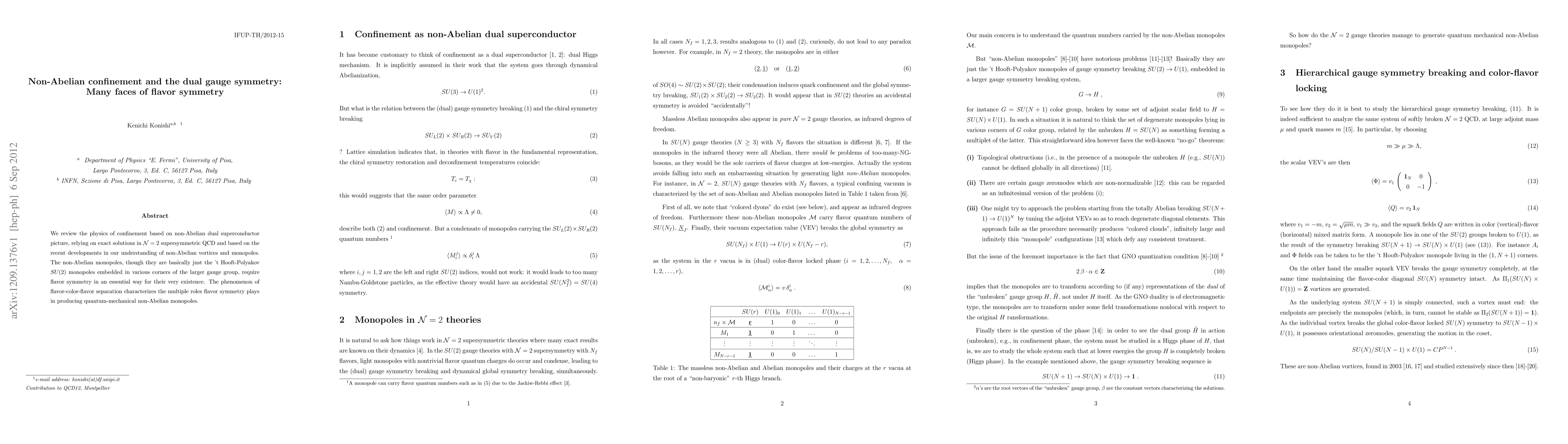 This paper reviews the concept of non-Abelian confinement through the dual superconductor picture, emphasizing the role of non-Abelian vortices and monopoles in N=2 supersymmetric QCD. It highlights how flavor symmetry is crucial for the existence of non-Abelian monopoles, showcasing flavor-color-flavor separation as a key feature.