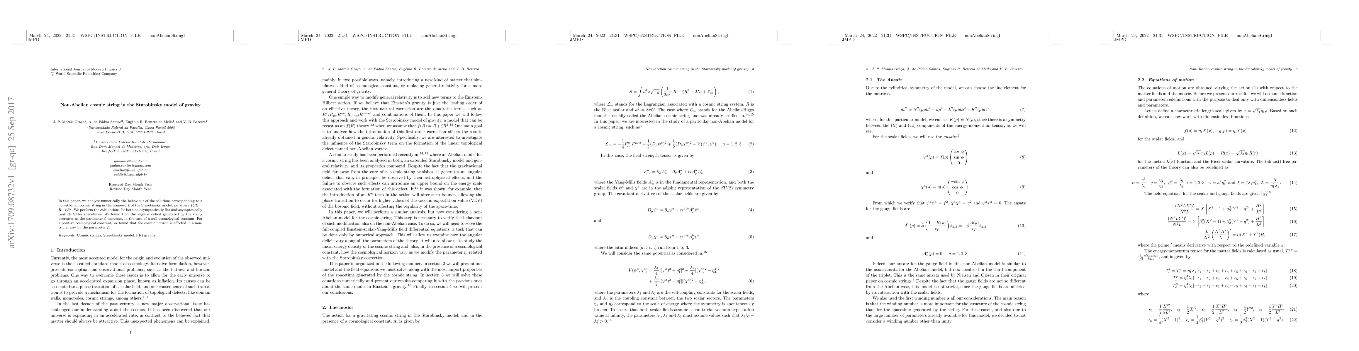 In this paper, we analyze numerically the behaviour of the solutions corresponding to a non-Abelian cosmic string in the framework of the Starobinsky model, i.e. where $f(R)=R + \zeta R^2$. We perform the calculations for both an asymptotically flat and asymptotically (anti)de Sitter spacetimes. We found that the angular deficit generated by the string decreases as the parameter $\zeta$ increases, in the case of a null cosmological constant. For a positive cosmological constant, we found that the cosmic horizon is affected in a non-trivial way by the parameter $\zeta$.