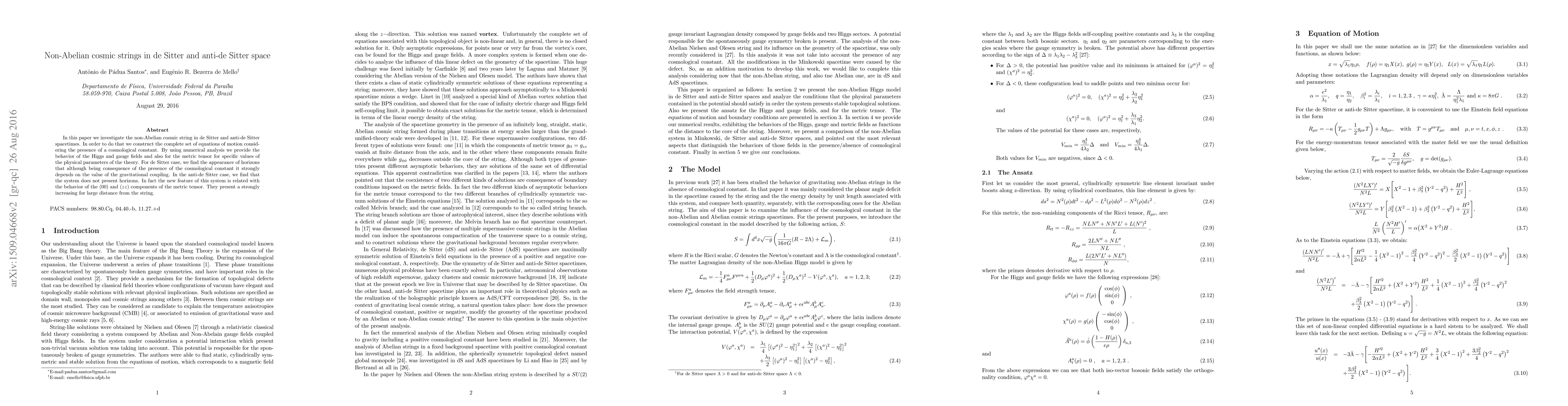 This paper studies non-Abelian cosmic strings in de Sitter and anti-de Sitter spacetimes, deriving equations of motion with cosmological constants and analyzing their behavior numerically. De Sitter spacetime shows horizons dependent on gravitational coupling, while anti-de Sitter lacks horizons and exhibits a unique increase in metric tensor components with distance.