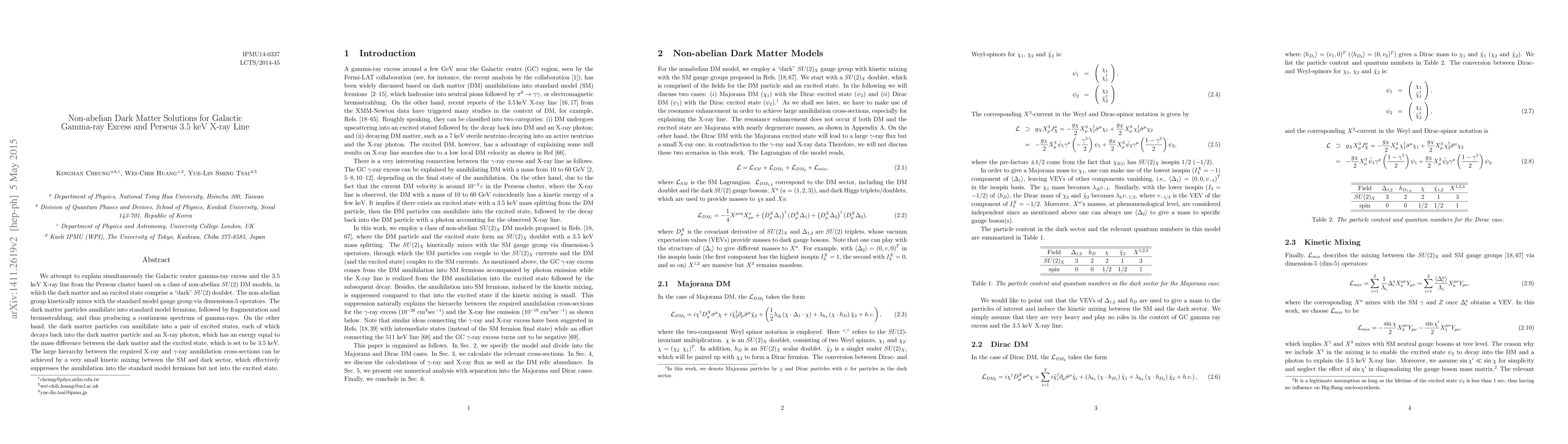 This paper proposes a non-abelian $SU(2)$ dark matter model to explain both the Galactic center gamma-ray excess and the 3.5 keV X-ray line from the Perseus cluster. The model features dark matter particles that annihilate into standard model fermions and excited states, producing gamma-rays and X-ray photons, respectively, through a small kinetic mixing with the standard model.