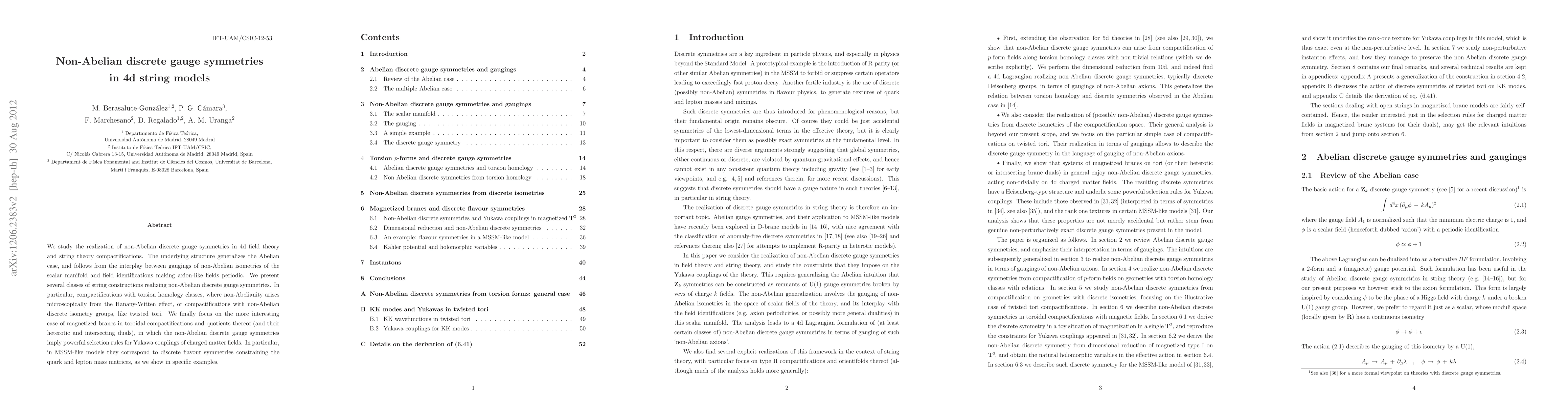 This paper investigates the realization of non-Abelian discrete gauge symmetries in 4d field theories and string theory compactifications, highlighting constructions like compactifications with torsion and magnetized branes. It demonstrates how these symmetries constrain Yukawa couplings and impose selection rules on quark and lepton mass matrices in MSSM-like models.