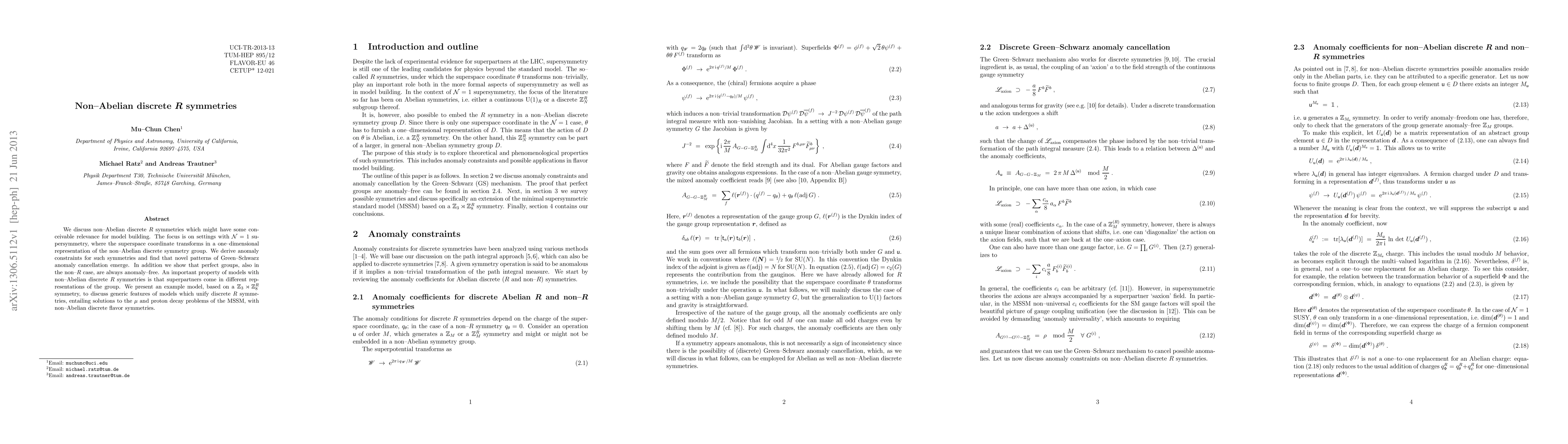 The research explores non-Abelian discrete R symmetries in N=1 supersymmetric settings, deriving anomaly constraints and demonstrating novel Green-Schwarz anomaly cancellation patterns.