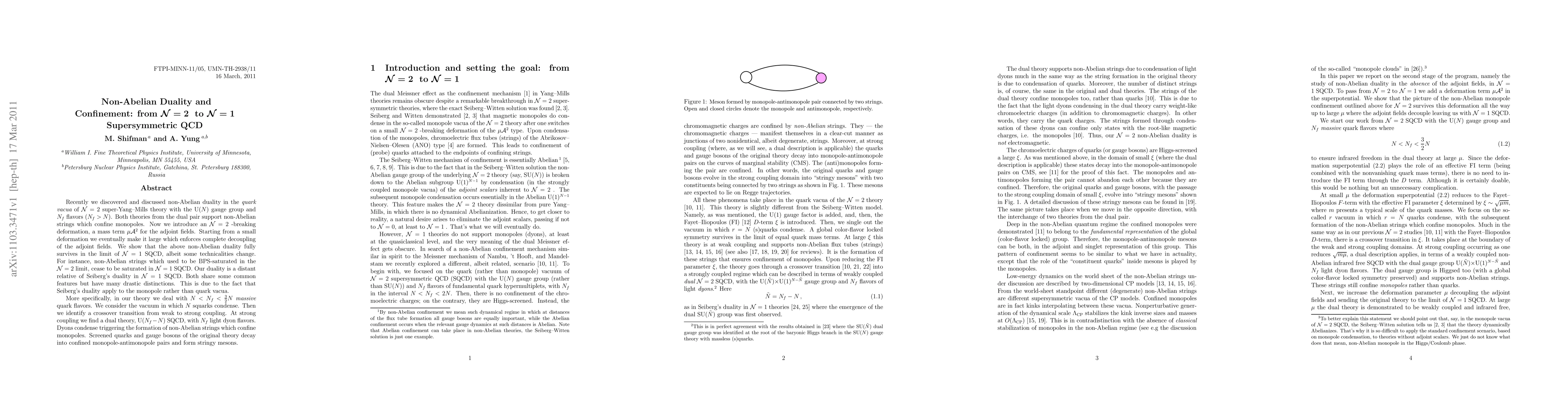 This paper explores non-Abelian duality in N=2 supersymmetric Yang-Mills theory transitioning to N=1 SQCD through an N=2-breaking deformation. The authors demonstrate that duality persists in N=1 SQCD, though non-Abelian strings no longer remain BPS-saturated, leading to significant distinctions compared to Seiberg's duality. The study identifies a crossover from weak to strong coupling in the presence of N massive quark flavors, resulting in a dual theory with N_f light dyon flavors that confine monopoles.