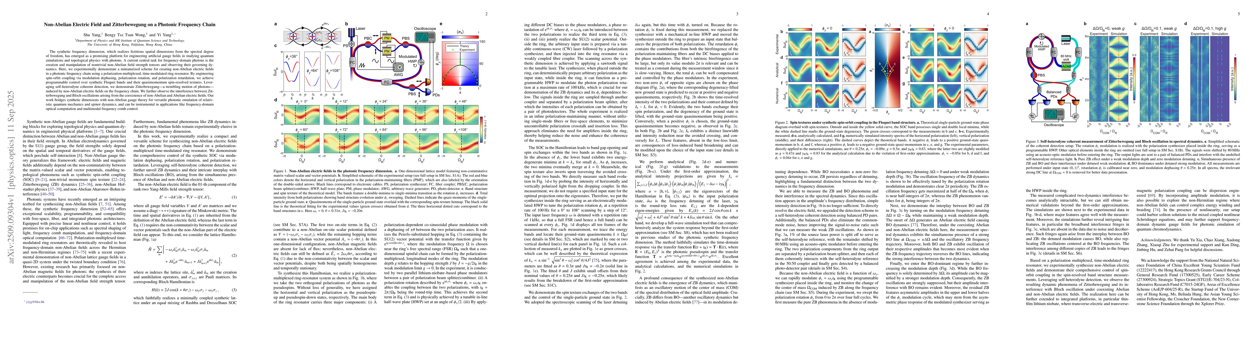 The synthetic frequency dimension, which realizes fictitious spatial dimensions from the spectral degree of freedom, has emerged as a promising platform for engineering artificial gauge fields in studying quantum simulations and topological physics with photons. A current central task for frequency-domain photons is the creation and manipulation of nontrivial non-Abelian field strength tensors and observing their governing dynamics. Here, we experimentally demonstrate a miniaturized scheme for creating non-Abelian electric fields in a photonic frequency chain using a polarization-multiplexed, time-modulated ring resonator. By engineering spin-orbit coupling via modulation dephasing, polarization rotation, and polarization retardation, we achieve programmable control over synthetic Floquet bands and their quasimomentum spin-resolved textures. Leveraging self-heterodyne coherent detection, we demonstrate Zitterbewegung -- a trembling motion of photons -- induced by non-Abelian electric fields on the frequency chain. We further observe the interference between Zitterbewegung and Bloch oscillations arising from the coexistence of non-Abelian and Abelian electric fields. Our work bridges synthetic dimensions with non-Abelian gauge theory for versatile photonic emulation of relativistic quantum mechanics and spinor dynamics, and can be instrumental in applications like frequency-domain optical computation and multimodal frequency comb control.