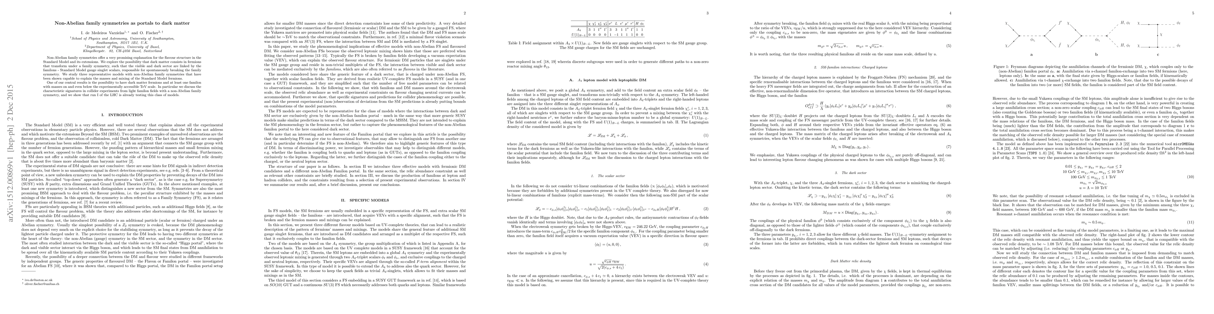 This paper explores non-Abelian family symmetries as potential explanations for the flavor structure in the Standard Model and proposes that dark matter could consist of fermions linked to the visible sector via familons. It investigates three representative models, finding that dark matter fermions and light familons could exist within the TeV scale, with collider experiments already probing these scenarios.