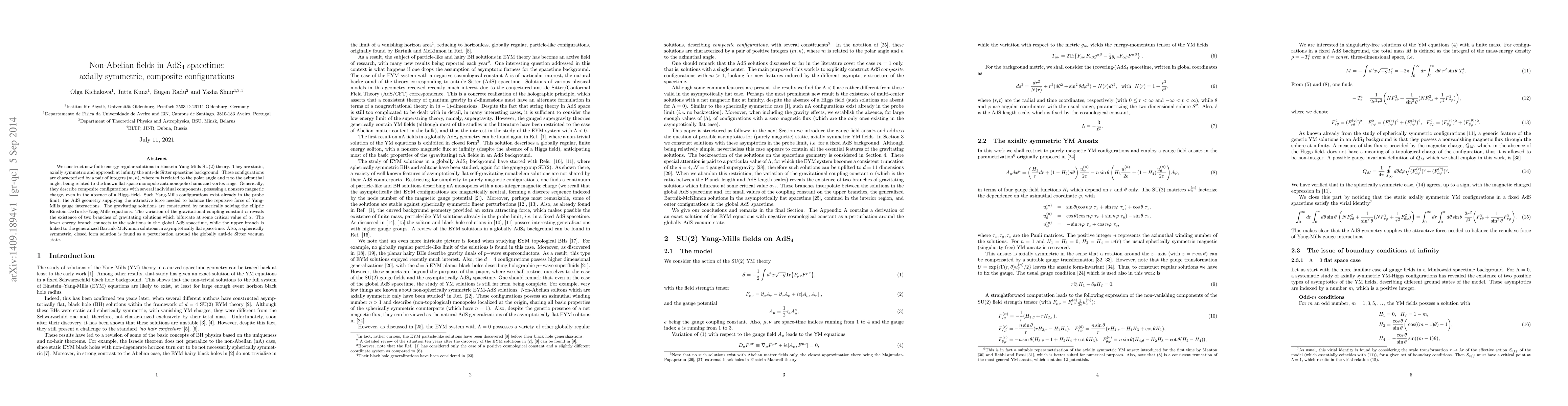 We construct new finite energy regular solutions in Einstein-Yang-Mills-SU(2) theory. They are static, axially symmetric and approach at infinity the anti-de Sitter spacetime background. These configurations are characterized by a pair of integers $(m, n)$, where $m$ is related to the polar angle and $n$ to the azimuthal angle, being related to the known flat space monopole-antimonopole chains and vortex rings. Generically, they describe composite configurations with several individual components, possesing a nonzero magnetic charge, even in the absence of a Higgs field. Such Yang-Mills configurations exist already in the probe limit, the AdS geometry supplying the attractive force needed to balance the repulsive force of Yang-Mills gauge interactions. The gravitating solutions are constructed by numerically solving the elliptic Einstein-DeTurck--Yang-Mills equations. The variation of the gravitational coupling constant $\alpha$ reveals the existence of two branches of gravitating solutions which bifurcate at some critical value of $\alpha$. The lower energy branch connects to the solutions in the global AdS spacetime, while the upper branch is linked to the generalized Bartnik-McKinnon solutions in asymptotically flat spacetime. Also, a spherically symmetric, closed form solution is found as a perturbation around the globally anti-de Sitter vacuum state.