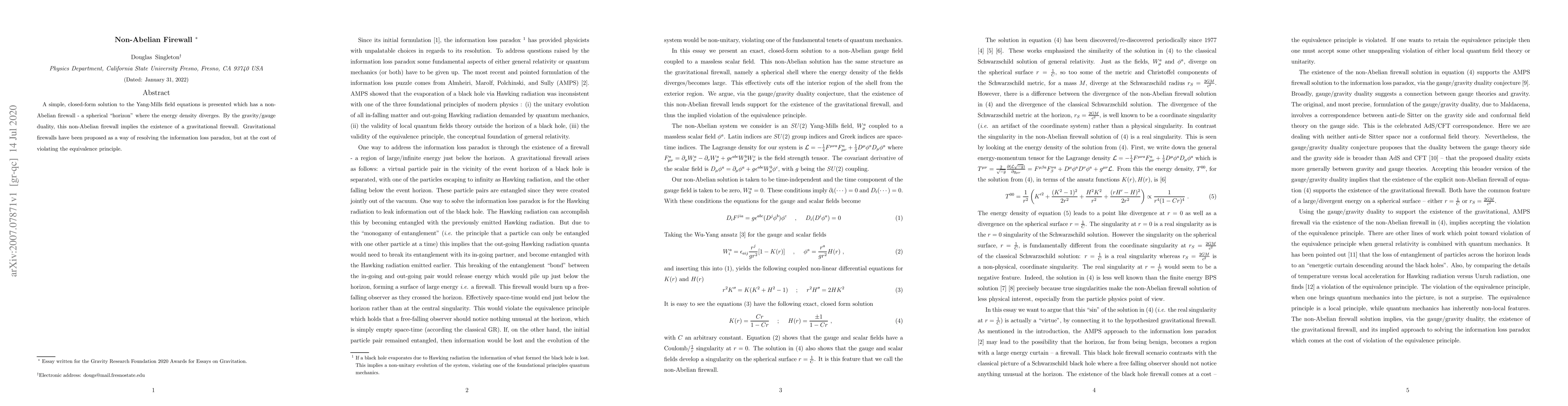 Summary: The paper presents a closed-form solution for Yang-Mills equations featuring a non-Abelian firewall, which implies a gravitational firewall, potentially resolving the information loss paradox but at the expense of violating the equivalence principle.