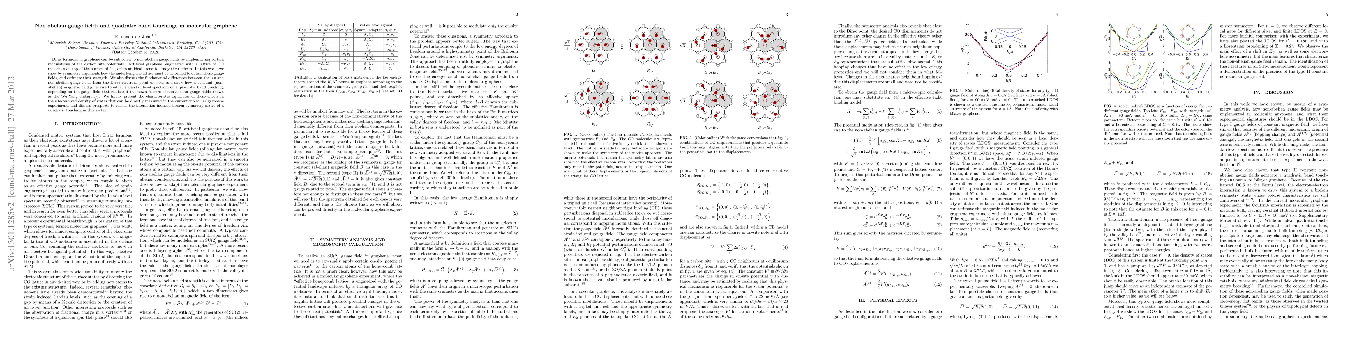 This paper explores how non-abelian gauge fields can be introduced in artificial graphene via modulations of carbon site potentials, specifically in CO lattices on Cu. It highlights the differences between abelian and non-abelian gauge fields and demonstrates how these fields can lead to either Landau levels or quadratic band touchings, presenting measurable signatures in the density of states.