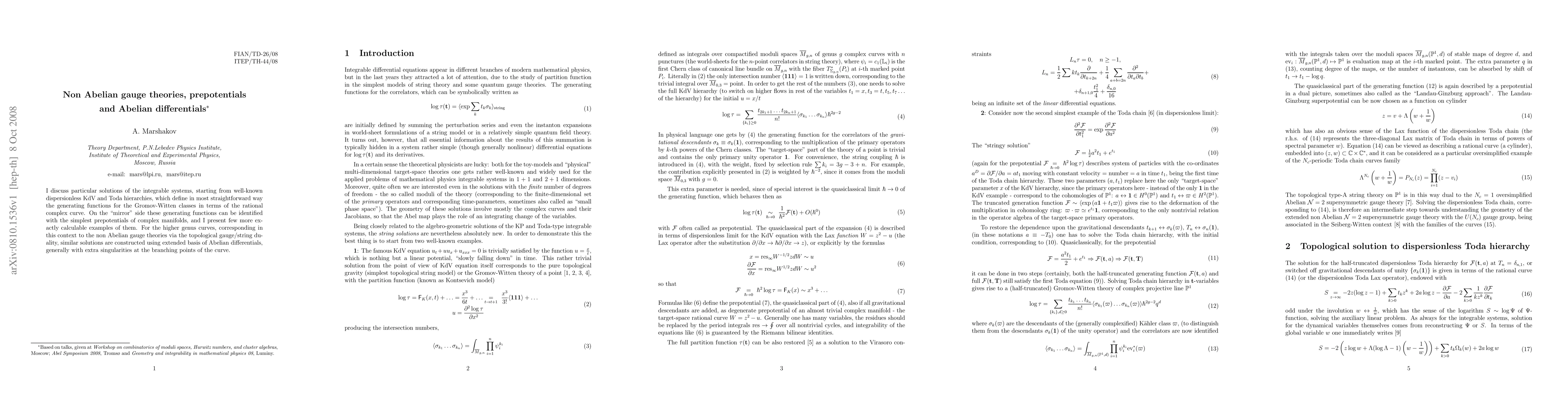 I discuss particular solutions of the integrable systems, starting from well-known dispersionless KdV and Toda hierarchies, which define in most straightforward way the generating functions for the Gromov-Witten classes in terms of the rational complex curve. On the ``mirror'' side these generating functions can be identified with the simplest prepotentials of complex manifolds, and I present few more exactly calculable examples of them. For the higher genus curves, corresponding in this context to the non Abelian gauge theories via the topological gauge/string duality, similar solutions are constructed using extended basis of Abelian differentials, generally with extra singularities at the branching points of the curve.