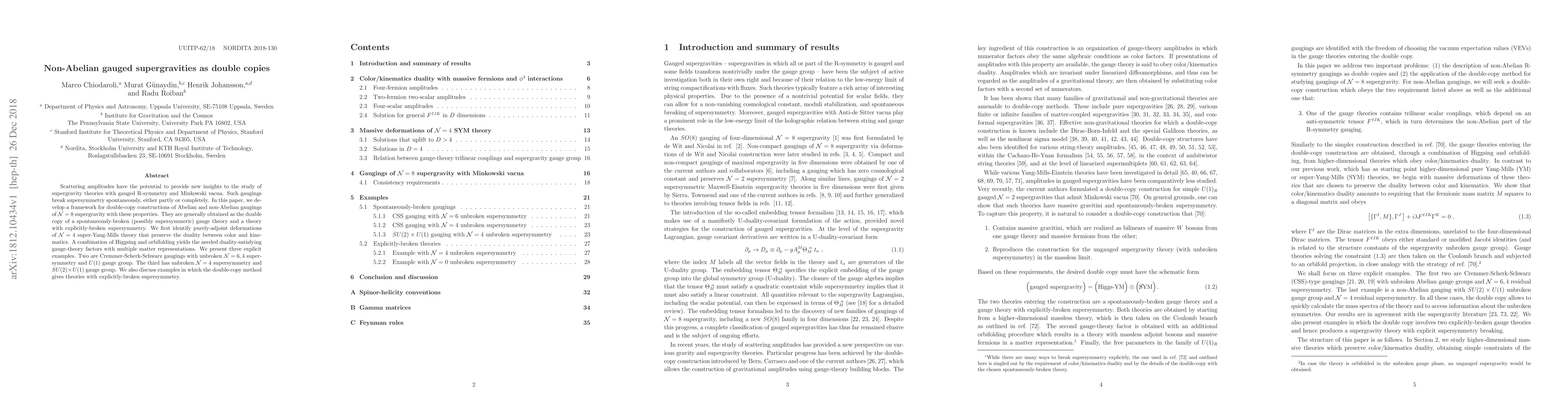 Scattering amplitudes have the potential to provide new insights to the study of supergravity theories with gauged R-symmetry and Minkowski vacua. Such gaugings break supersymmetry spontaneously, either partly or completely. In this paper, we develop a framework for double-copy constructions of Abelian and non-Abelian gaugings of N=8 supergravity with these properties. They are generally obtained as the double copy of a spontaneously-broken (possibly supersymmeric) gauge theory and a theory with explicitly-broken supersymmetry. We first identify purely-adjoint deformations of N=4 super-Yang-Mills theory that preserve the duality between color and kinematics. A combination of Higgsing and orbifolding yields the needed duality-satisfying gauge-theory factors with multiple matter representations. We present three explicit examples. Two are Cremmer-Scherk-Schwarz gaugings with unbroken N=6,4 supersymmetry and U(1) gauge group. The third has unbroken N=4 supersymmetry and SU(2)xU(1) gauge group. We also discuss examples in which the double-copy method gives theories with explicitly-broken supersymmetry.