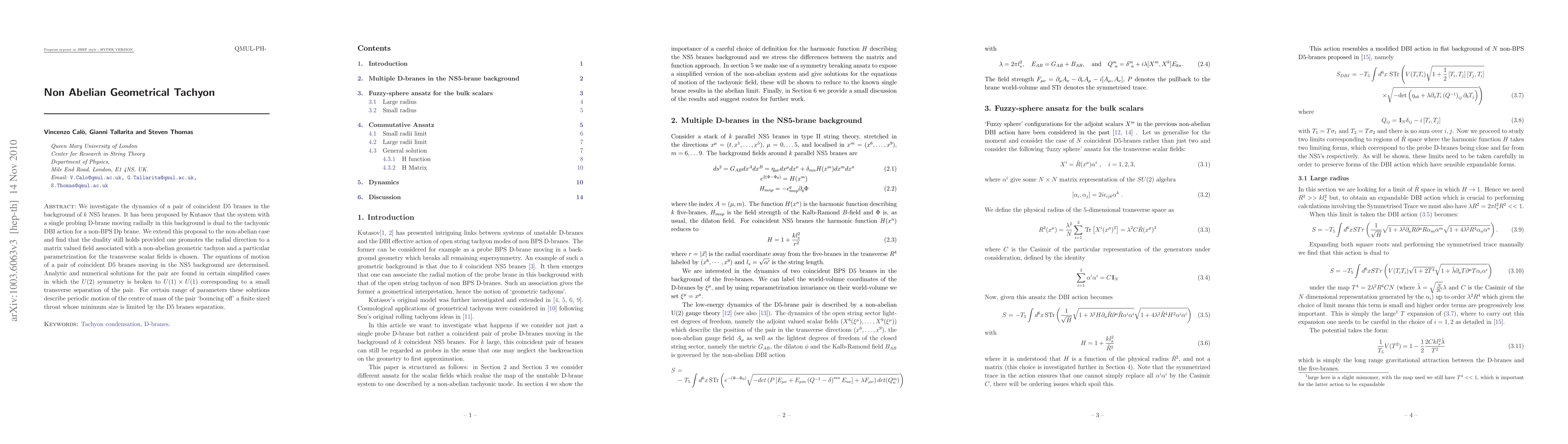Researchers found a dual connection between a pair of coincident D5 branes in an NS5 background and a non-abelian geometric tachyon, enabling periodic motion that 'bounces off' a finite throat size.