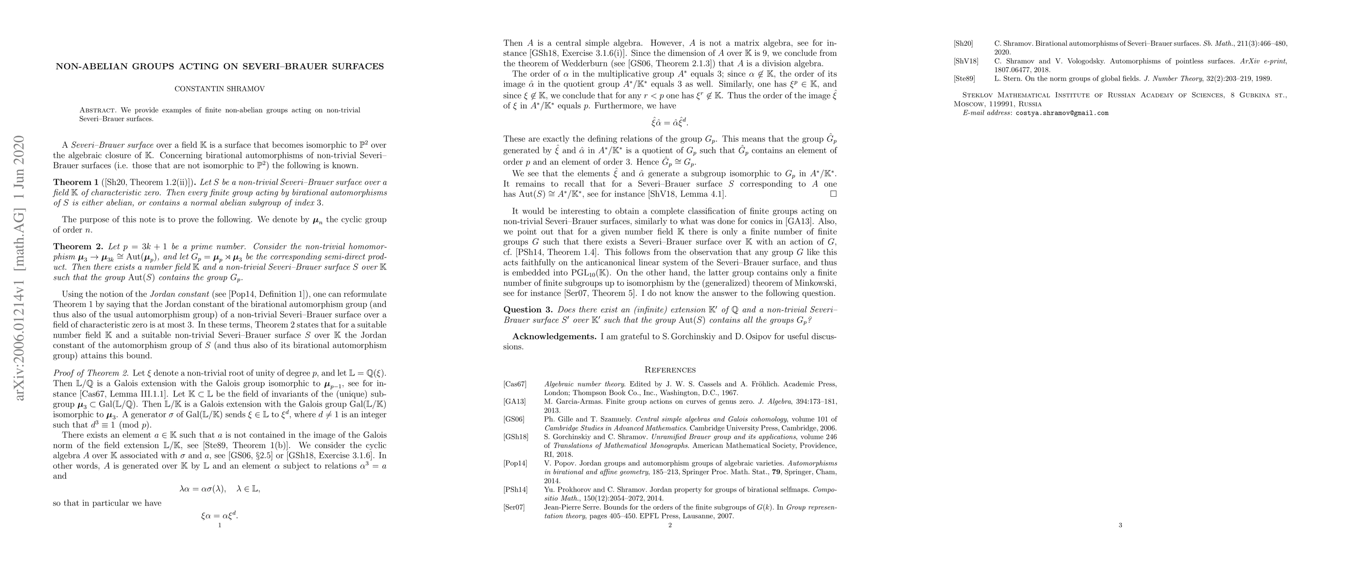Summary: This paper explores instances of finite non-abelian groups that act on non-trivial Severi-Brauer surfaces, providing significant examples in the study of algebraic geometry and group actions.
