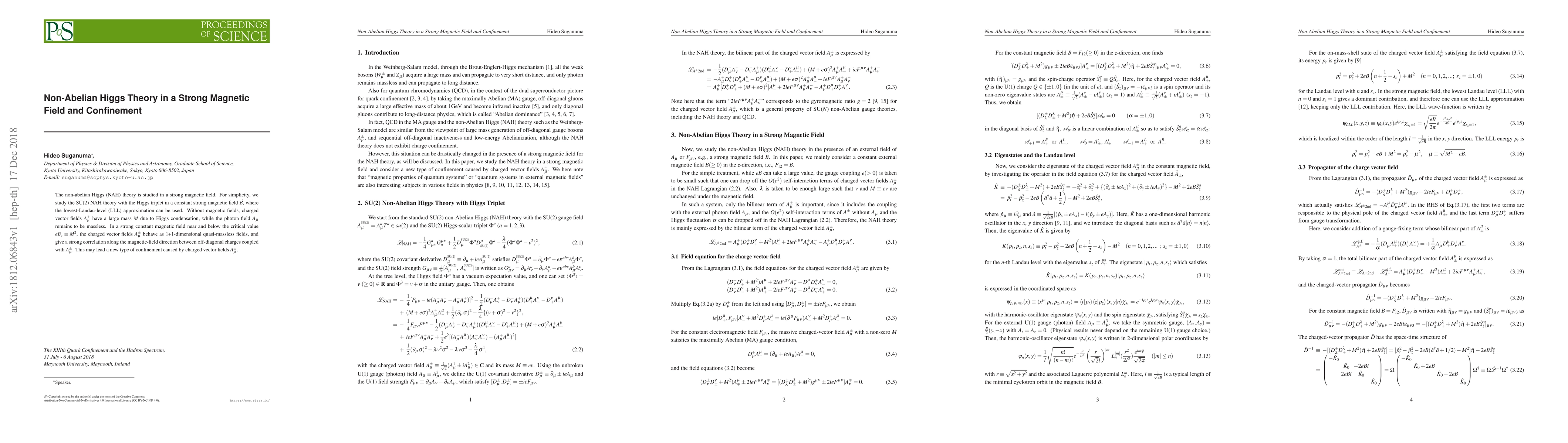 The non-abelian Higgs (NAH) theory is studied in a strong magnetic field. For simplicity, we study the SU(2) NAH theory with the Higgs triplet in a constant strong magnetic field $\vec B$, where the lowest-Landau-level (LLL) approximation can be used. Without magnetic fields, charged vector fields $A_\mu^\pm$ have a large mass $M$ due to Higgs condensation, while the photon field $A_\mu$ remains to be massless. In a strong constant magnetic field near and below the critical value $eB_c \equiv M^2$, the charged vector fields $A_\mu^\pm$ behave as 1+1-dimensional quasi-massless fields, and give a strong correlation along the magnetic-field direction between off-diagonal charges coupled with $A_\mu^\pm$. This may lead a new type of confinement caused by charged vector fields $A_\mu^\pm$.