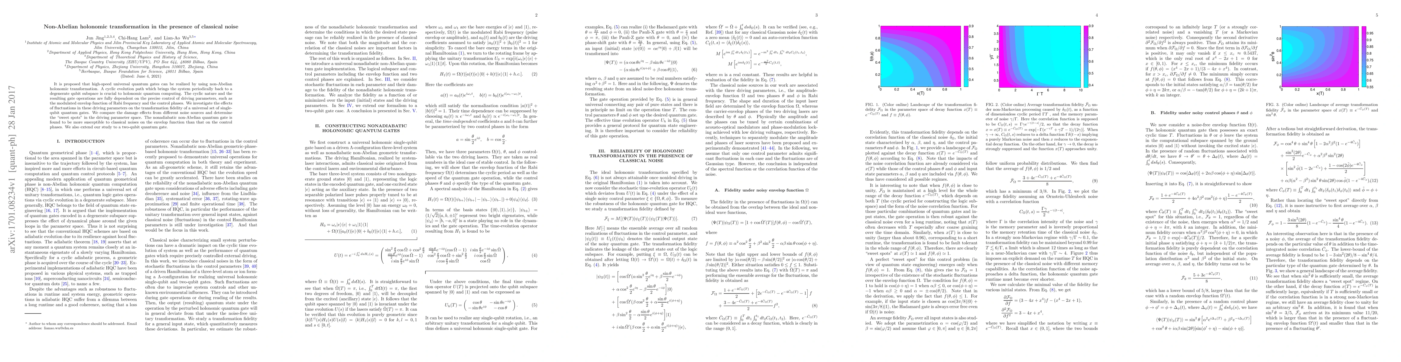 This paper explores the implementation of high-speed universal quantum gates via non-Abelian holonomic transformations, emphasizing the impact of classical noise on gate fidelity. It identifies that non-Abelian quantum gates are more sensitive to fluctuations in the modulated envelope function than in control phases, and extends the analysis to two-qubit gates.