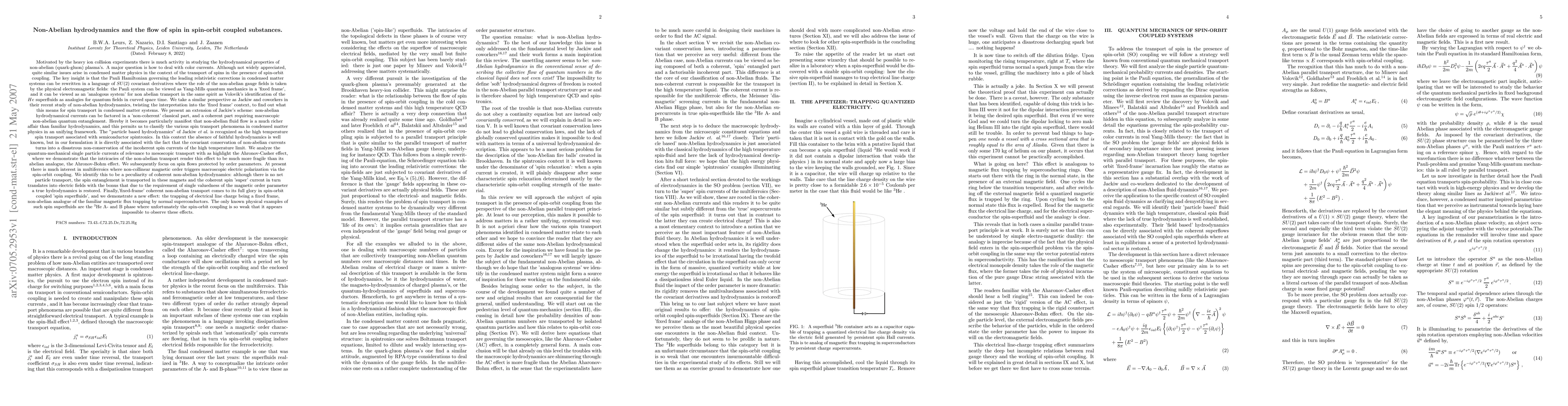 Motivated by heavy ion collision experiments, we study the hydrodynamic properties of non-Abelian systems. These issues arise in condensed matter physics in the context of transport of spins in the presence of spin orbit coupling: the Pauli Hamiltonian governing the leading relativistic corrections in condensed matter systems can be rewritten in a language of SU(2) covariant derivatives, where the role of the non-Abelian gauge fields is taken by the physical electromagnetic fields. Taking a similar perspective as Jackiw and coworkers, we show that non-abelian hydrodynamical currents can be factored in a non-coherent 'classical' part, and a coherent part requiring macroscopic non-abelian quantum entanglement. Non-abelian flow being thus a much richer affair than familiar hydrodynamics, permits us to classify the various spin transport phenomena in in condensed matter physics in a unifying framework.In semiconductor spintronics, the absence of hydrodynamics is well known, but in our formulation it is directly associated with the fact that non-abelian currents are only covariantly conserved.We analyze the quantum mechanical single particle currents of relevance to mesoscopic transport with as highlight the Aharonov-Casher effect, where we demonstrate that the non-abelian transport structure renders it much more fragile than its abelian counterpart, the Aharonov-Bohm effect. We subsequently focus on spin flows protected by order parameters, of which the spin-spiral magnets and the spin superfluids are important examples. The surprising bonus is that the presence of an order parameter, being single-valued, restores hydrodynamics. We demonstrate a new effect: the trapping of electrical line charge, being the 'fixed frame' non-Abelian analogue of the familiar magnetic flux trapping by superconductors.