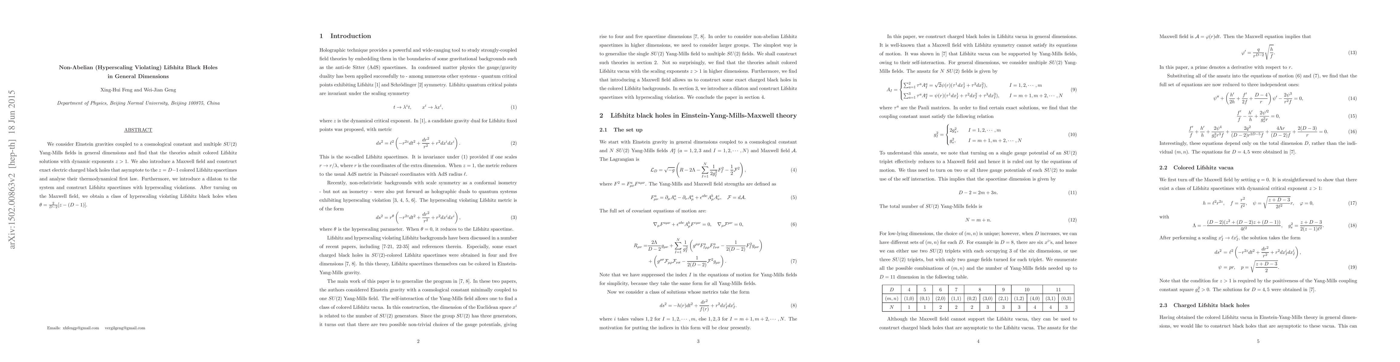 This paper explores Einstein gravities with $SU(2)$ Yang-Mills fields in general dimensions, discovering non-Abelian Lifshitz black holes with dynamic exponents greater than 1. It also constructs electric charged black holes asymptoting to $z=D-1$ colored Lifshitz spacetimes and analyzes their thermodynamical first law, introducing hyperscaling violations via a dilaton.