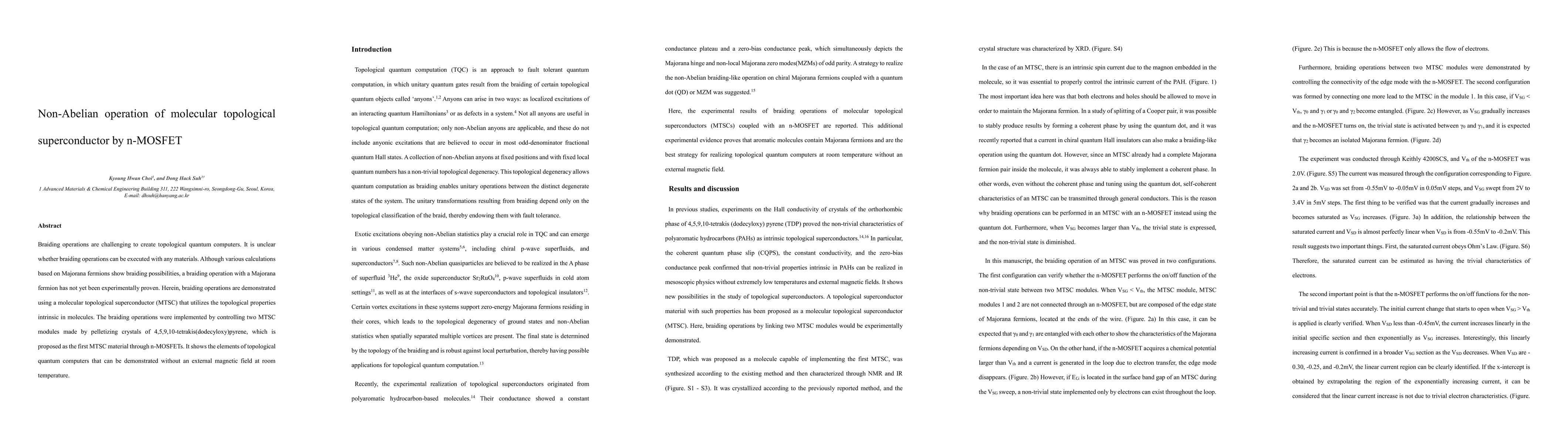 Braiding operations are challenging to create topological quantum computers. It is unclear whether braiding operations can be executed with any materials. Although various calculations based on Majorana fermions show braiding possibilities, a braiding operation with a Majorana fermion has not yet been experimentally proven. Herein, braiding operations are demonstrated using a molecular topological superconductor (MTSC) that utilizes the topological properties intrinsic in molecules. The braiding operations were implemented by controlling two MTSC modules made by pelletizing crystals of 4,5,9,10-tetrakis(dodecyloxy)pyrene, which is proposed as the first MTSC material through n-MOSFETs. It shows the elements of topological quantum computers that can be demonstrated without an external magnetic field at room temperature.