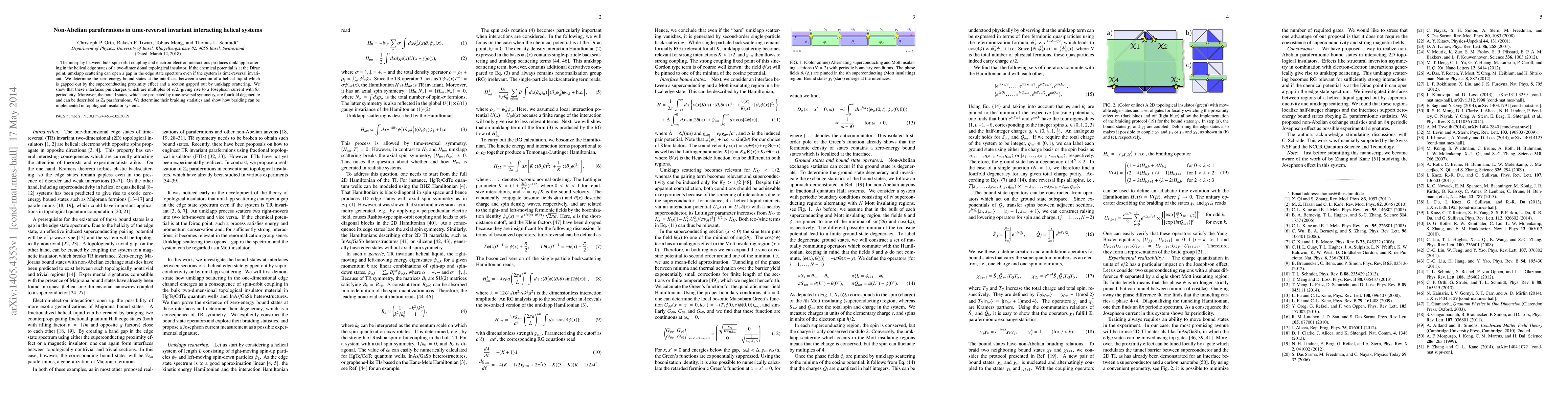 This paper investigates the emergence of non-Abelian parafermions in helical systems with time-reversal symmetry, revealing that umklapp scattering can induce a gap in edge states. The study finds $\mathbb{Z}_4$ parafermions at the interfaces between gapped sections, exhibiting $8\pi$ Josephson current periodicity and fourfold degenerate braiding statistics.