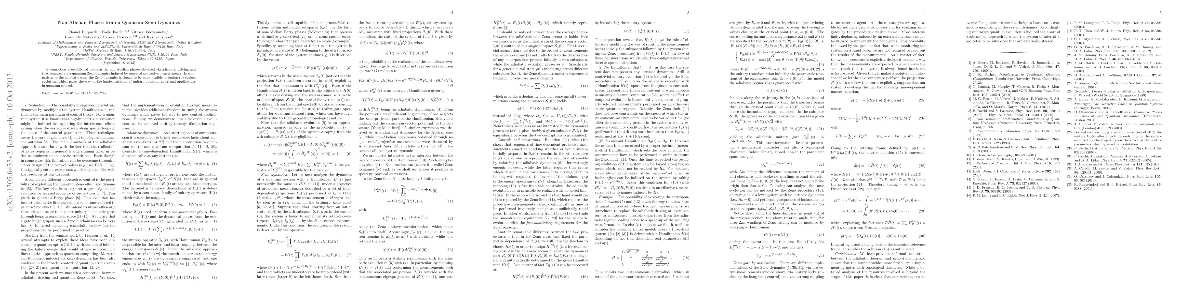 Summary: This paper establishes a link between non-Abelian phases generated through adiabatic driving and those via quantum Zeno dynamics from repeated measurements. The study reveals that Zeno dynamics offers greater flexibility in system evolution, facilitating the implementation of unitary quantum gates and enhancing quantum control applications.