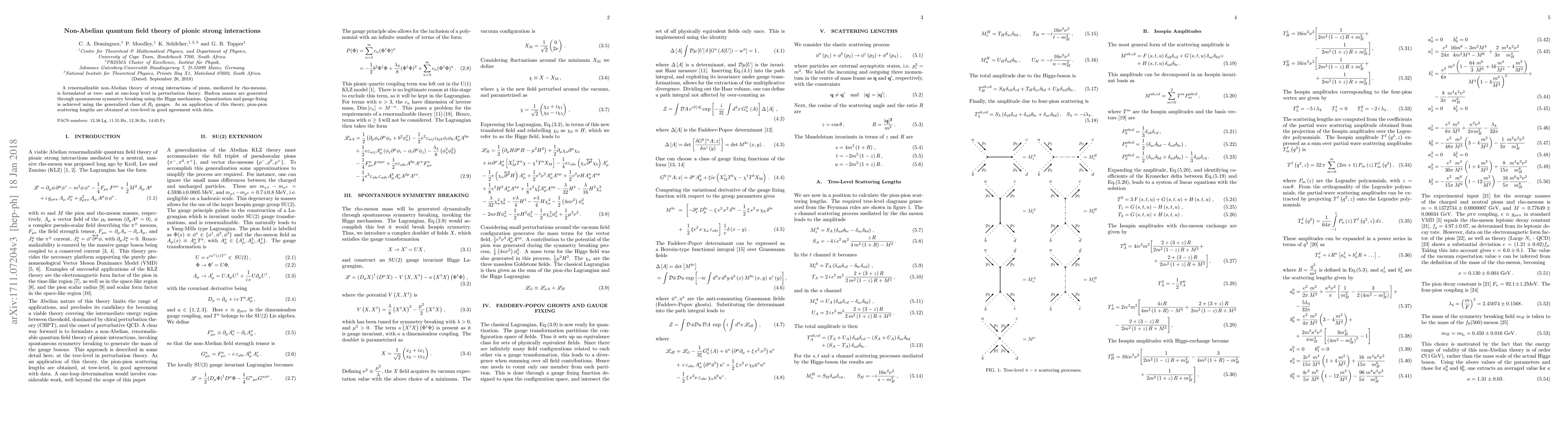 A renormalizable non-Abelian theory of strong interactions of pions, mediated by rho-mesons, is formulated at tree- and at one-loop level in perturbation theory. Hadron masses are generated through spontaneous symmetry breaking using the Higgs mechanism. Quantization and gauge fixing is achieved using the generalized class of $R_\xi$ gauges. As an application of this theory, pion-pion scattering lengths are obtained at tree-level in good agreement with data.