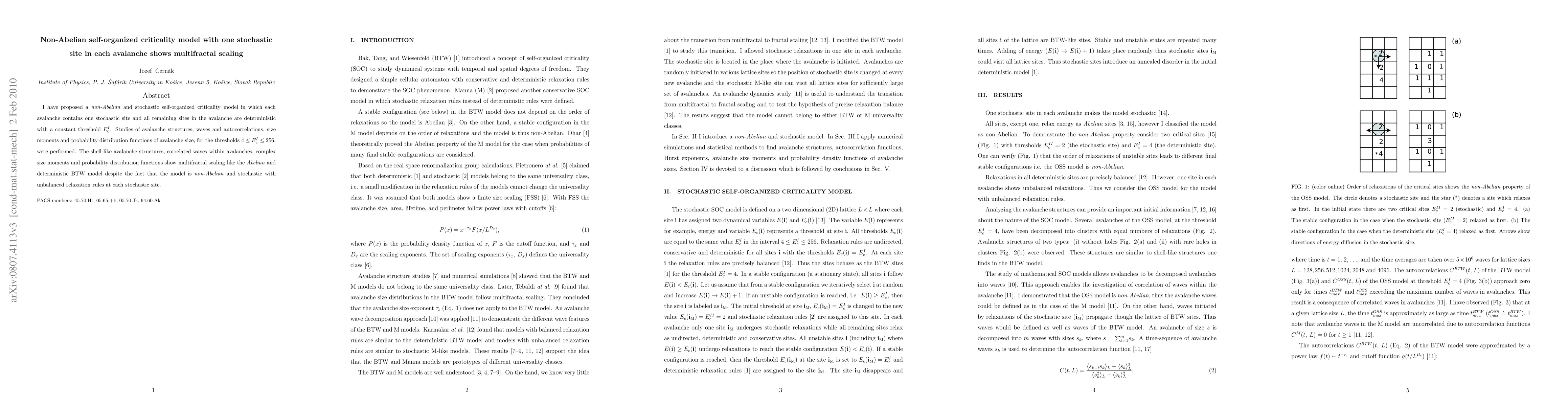 This paper proposes a non-Abelian stochastic self-organized criticality model featuring one stochastic site per avalanche, with the rest being deterministic. Despite its non-Abelian and stochastic nature, the model exhibits multifractal scaling in avalanche structures, waves, and size distributions, similar to the Abelian Bak-Tang-Wiesenfeld model.