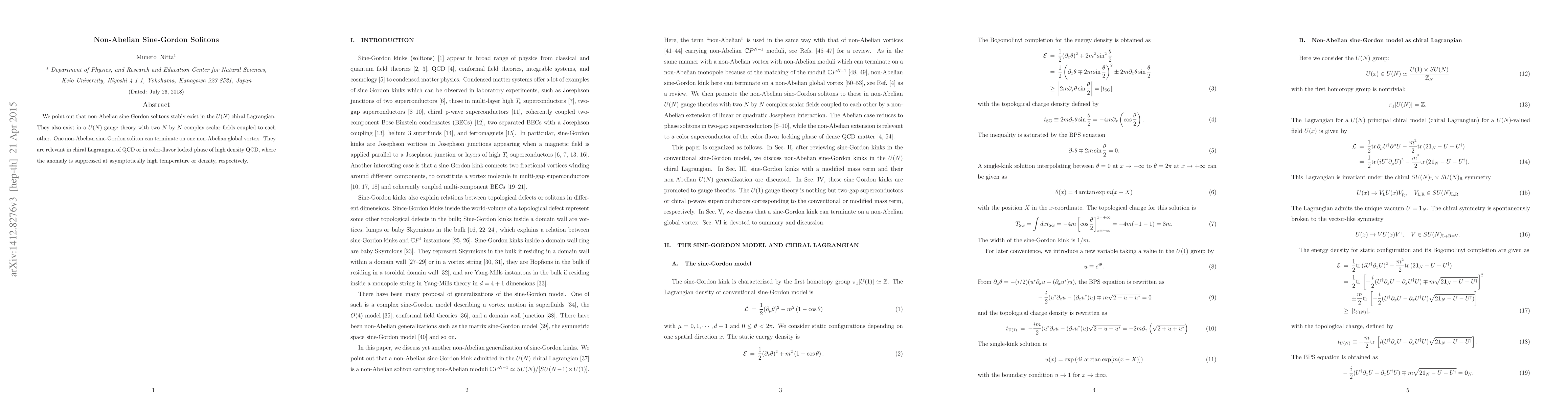 Summary: Non-Abelian sine-Gordon solitons in $U(N)$ chiral Lagrangians and gauge theories with coupled complex scalar fields can stabilize solitons that terminate on global vortices, relevant in QCD's chiral Lagrangian or color-flavor locked phases at high temperatures or densities.