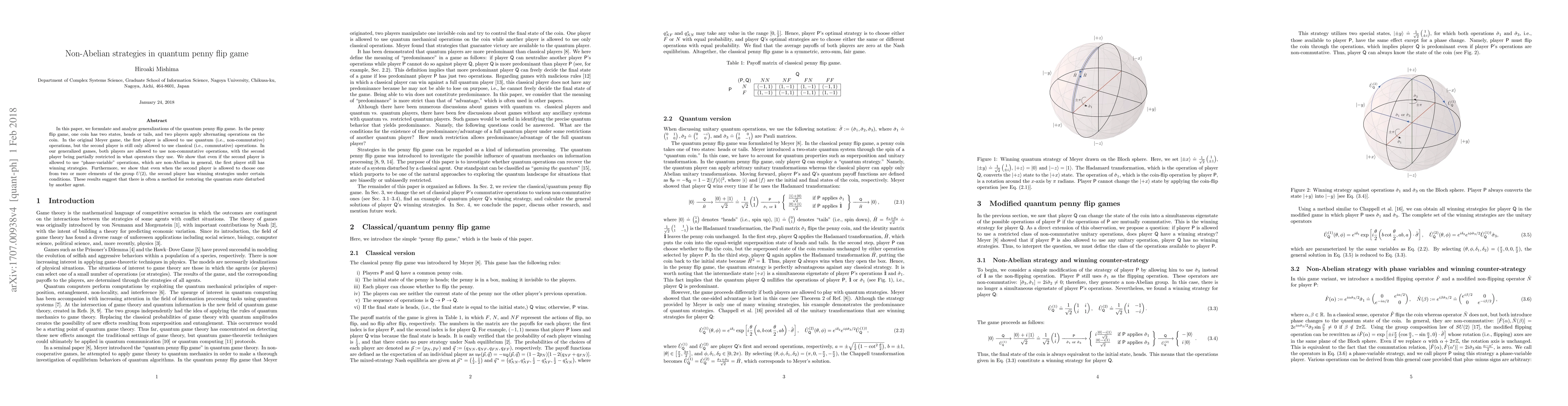 This paper generalizes the quantum penny flip game where both players can use non-commutative operations, showing that the first player retains winning strategies even when the second player employs non-Abelian phase-variable operations. It also demonstrates that under specific conditions, the second player can still win if restricted to choosing from a subset of $U(2)$ operators.