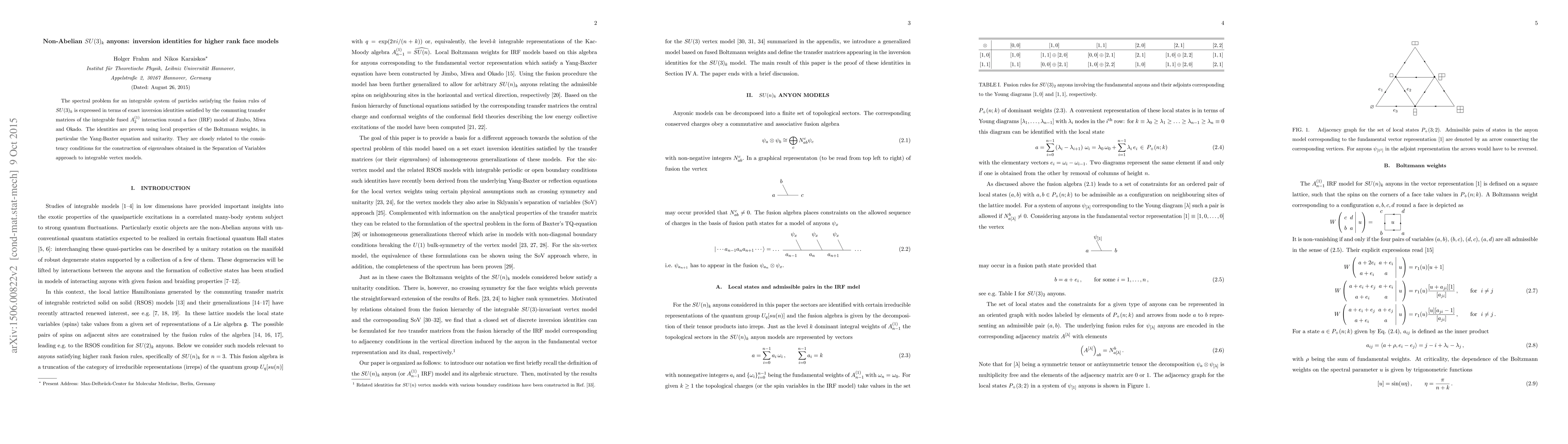 The spectral problem for an integrable system of particles satisfying the fusion rules of $SU(3)_k$ is expressed in terms of exact inversion identities satisfied by the commuting transfer matrices of the integrable fused $A_2^{(1)}$ interaction round a face (IRF) model of Jimbo, Miwa and Okado. The identities are proven using local properties of the Boltzmann weights, in particular the Yang-Baxter equation and unitarity. They are closely related to the consistency conditions for the construction of eigenvalues obtained in the Separation of Variables approach to integrable vertex models.