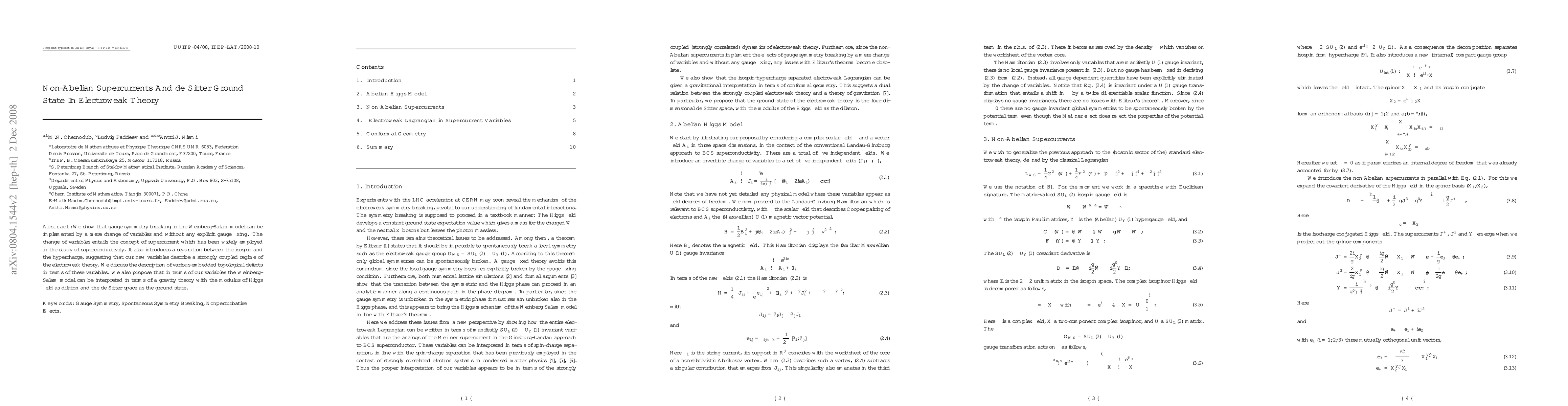 We show that gauge symmetry breaking in the Weinberg-Salam model can be implemented by a mere change of variables and without any explicit gauge fixing. The change of variables entails the concept of supercurrent which has been widely employed in the study of superconductivity. It also introduces a separation between the isospin and the hypercharge, suggesting that our new variables describe a strongly coupled regime of the electroweak theory. We discuss the description of various embedded topological defects in terms of these variables. We also propose that in terms of our variables the Weinberg-Salam model can be interpreted in terms of a gravity theory with the modulus of Higgs field as dilaton and the de Sitter space as the ground state.
