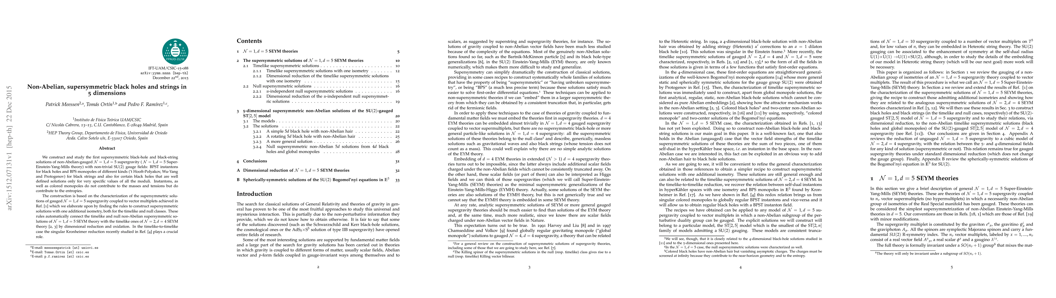 This paper constructs and analyzes the first supersymmetric black-hole and black-string solutions in non-Abelian-gauged N=1, d=5 supergravity, incorporating non-trivial SU(2) gauge fields. It finds that instantons and colored monopoles affect entropy but not mass or tension.