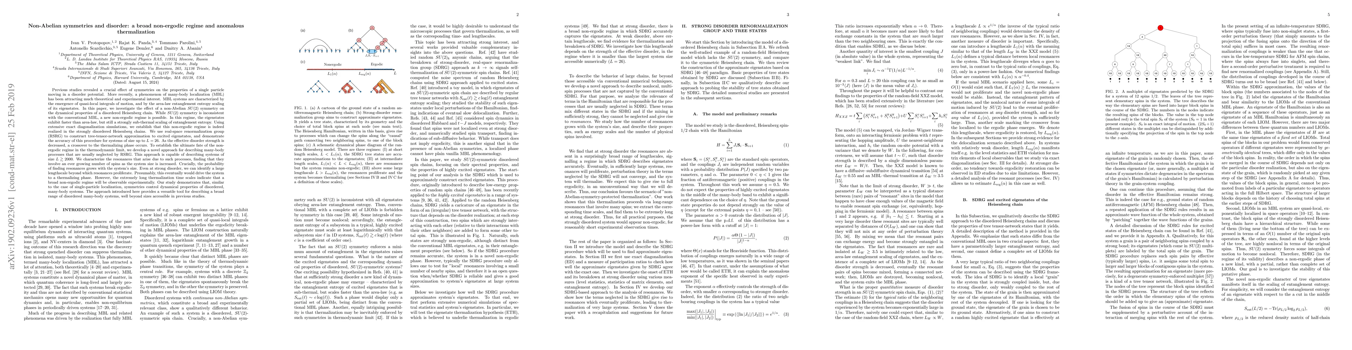 Symmetries play a central role in single-particle localization. Recent research focused on many-body localized (MBL) systems, characterized by new kind of integrability, and by the area-law entanglement of eigenstates. We investigate the effect of a non-Abelian $SU(2)$ symmetry on the dynamical properties of a disordered Heisenberg chain. While $SU(2)$ symmetry is inconsistent with the conventional MBL, a new non-ergodic regime is possible. In this regime, the eigenstates exhibit faster than area-law, but still a strongly sub-thermal scaling of entanglement entropy. Using exact diagonalization, we establish that this non-ergodic regime is indeed realized in the strongly disordered Heisenberg chains. We use real-space renormalization group (RSRG) to construct approximate excited eigenstates, and show their accuracy for systems of size up to $L=26$. As disorder strength is decreased, a crossover to the thermalizing phase occurs. To establish the ultimate fate of the non-ergodic regime in the thermodynamic limit, we develop a novel approach for describing many-body processes that are usually neglected by RSRG, accessing systems of size $L>2000$. We characterize the resonances that arise due to such processes, finding that they involve an ever growing number of spins as the system size is increased. The probability of finding resonances grows with the system size. Even at strong disorder, we can identify a large lengthscale beyond which resonances proliferate. Presumably, this eventually would drive the system to a thermalizing phase. However, the extremely long thermalization time scales indicate that a broad non-ergodic regime will be observable experimentally. Our study demonstrates that symmetries control dynamical properties of disordered, many-body systems. The approach introduced here provides a versatile tool for describing a broad range of disordered many-body systems.