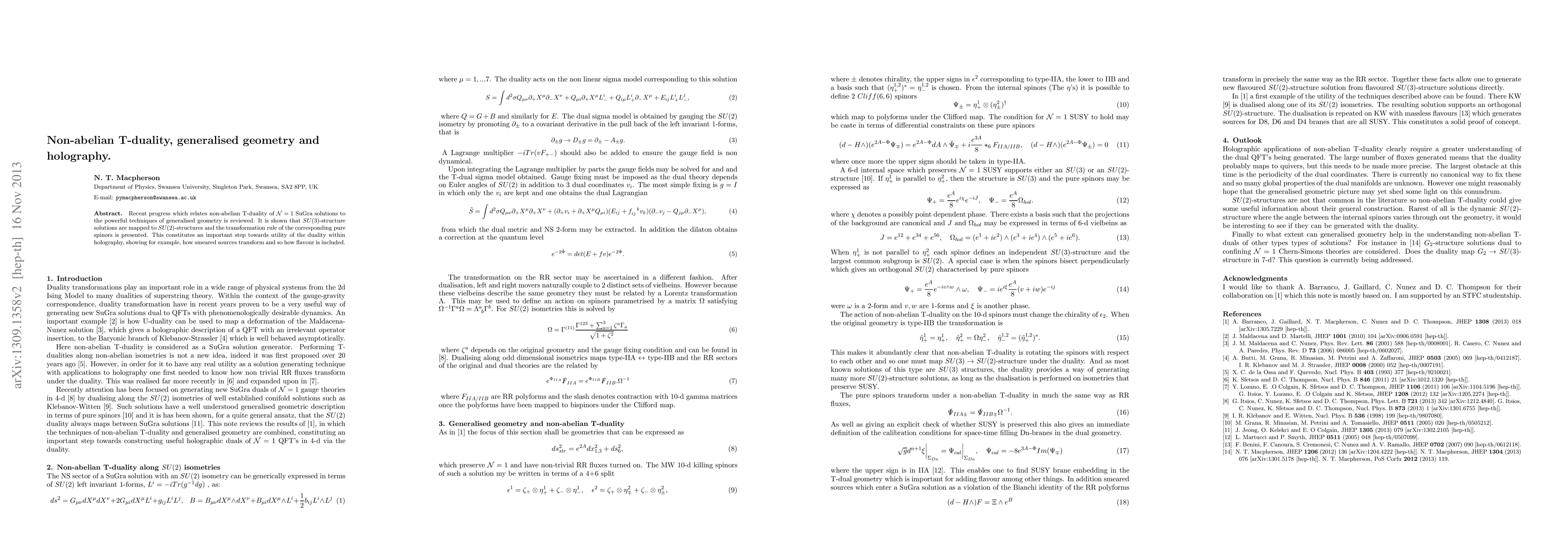 Recent progress which relates non-abelian T-duality of $\mathcal{N}=1$ SuGra solutions to the powerful techniques of Generalised geometry is reviewed. It is shown that SU(3) structure solutions are mapped to SU(2) structures and the transformation rule of the corresponding pure spinors is presented. This constitutes an important step on the road towards the utility of the duality within holography, showing for example, how smeared sources must transform and so how to add flavour to the T-duals.