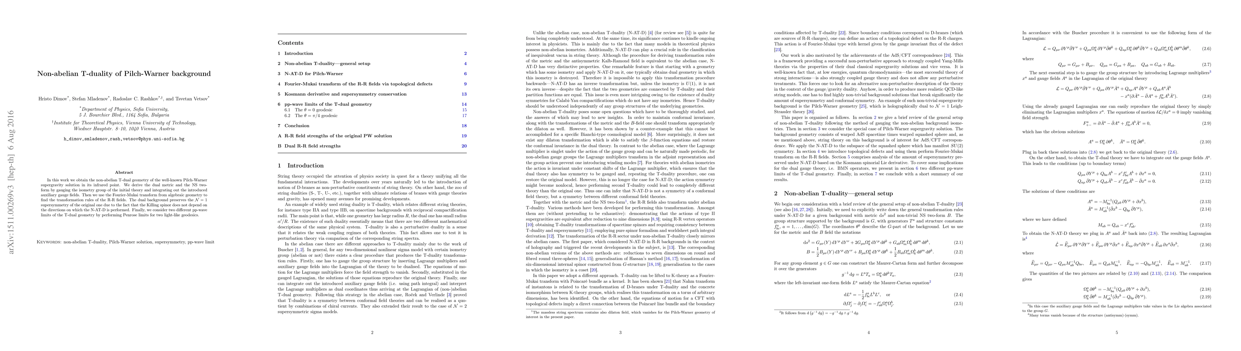 In this work we obtain the non-abelian T-dual geometry of the well-known Pilch-Warner supergravity solution in its infrared point. We derive the dual metric and the NS two-form by gauging the isometry group of the initial theory and integrating out the introduced auxiliary gauge fields. Then we use the Fourier-Mukai transform from algebraic geometry to find the transformation rules of the R-R fields. The dual background preserves the $\mathcal{N}=1$ supersymmetry of the original one due to the fact that the Killing spinor does not depend on the directions on which the N-AT-D is performed. Finally, we consider two different pp-wave limits of the T-dual geometry by performing Penrose limits for two light-like geodesics.
