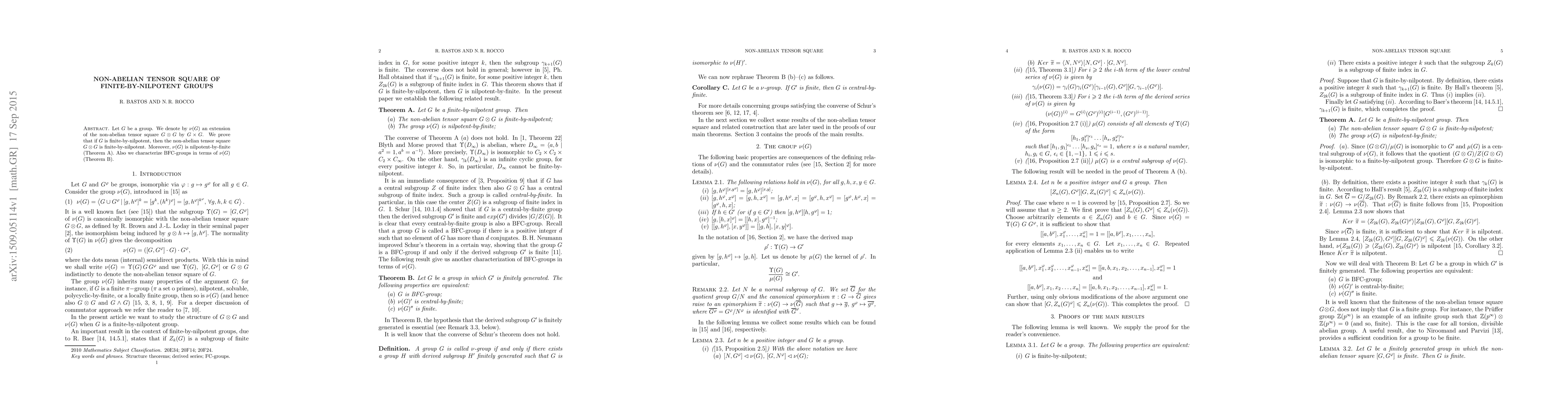 This paper investigates the non-abelian tensor square of finite-by-nilpotent groups, proving that such groups maintain this property and characterizing BFC-groups using the extension $\nu(G)$ of the non-abelian tensor square.